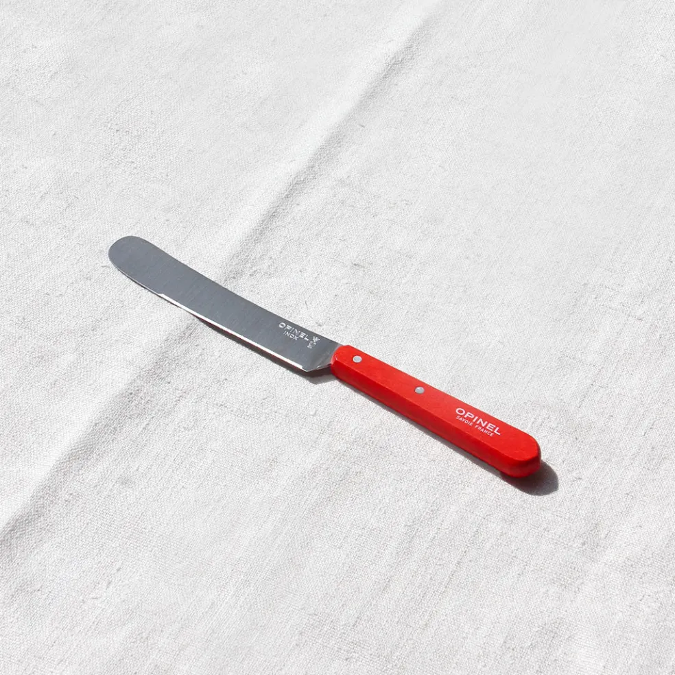 Le couteau à beurre dit « tartineur » ou le couteau indispensable du petit-déjeuner. Ce couteau Opinel est doté d’une grande lame en inox et d’un manche en bois rouge corail. Son bout arrondi et plat permet d’étaler facilement les crèmes, beurres et tartinades et la partie dentée de la lame offre une bonne découpe des tartines.