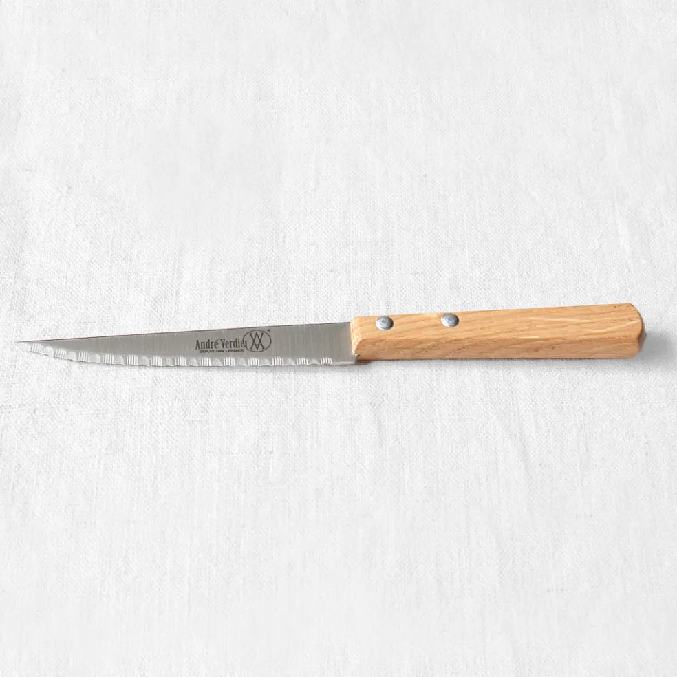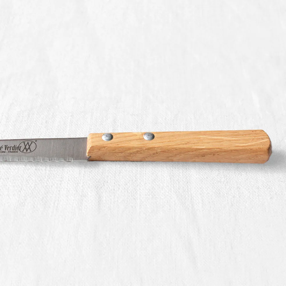Un couteau à steak avec manche en bois de chêne muni d’une lame dentée en inox, adapté à la découpe de viande. Son manche en chêne riveté donne une allure rustique à ce couteau artisanal fabriqué en France dans la région de Thiers. Très facile à accorder avec des couverts en inox.