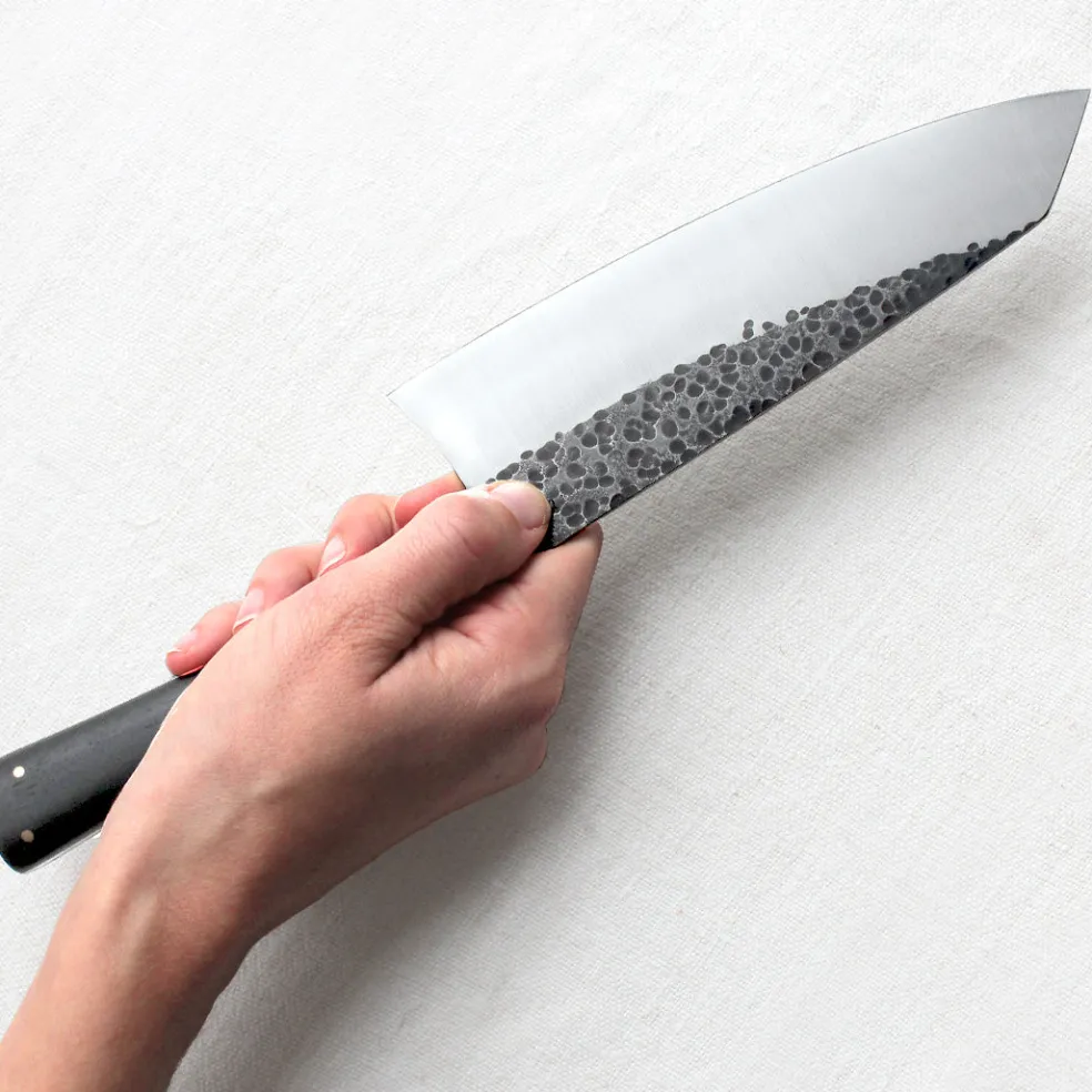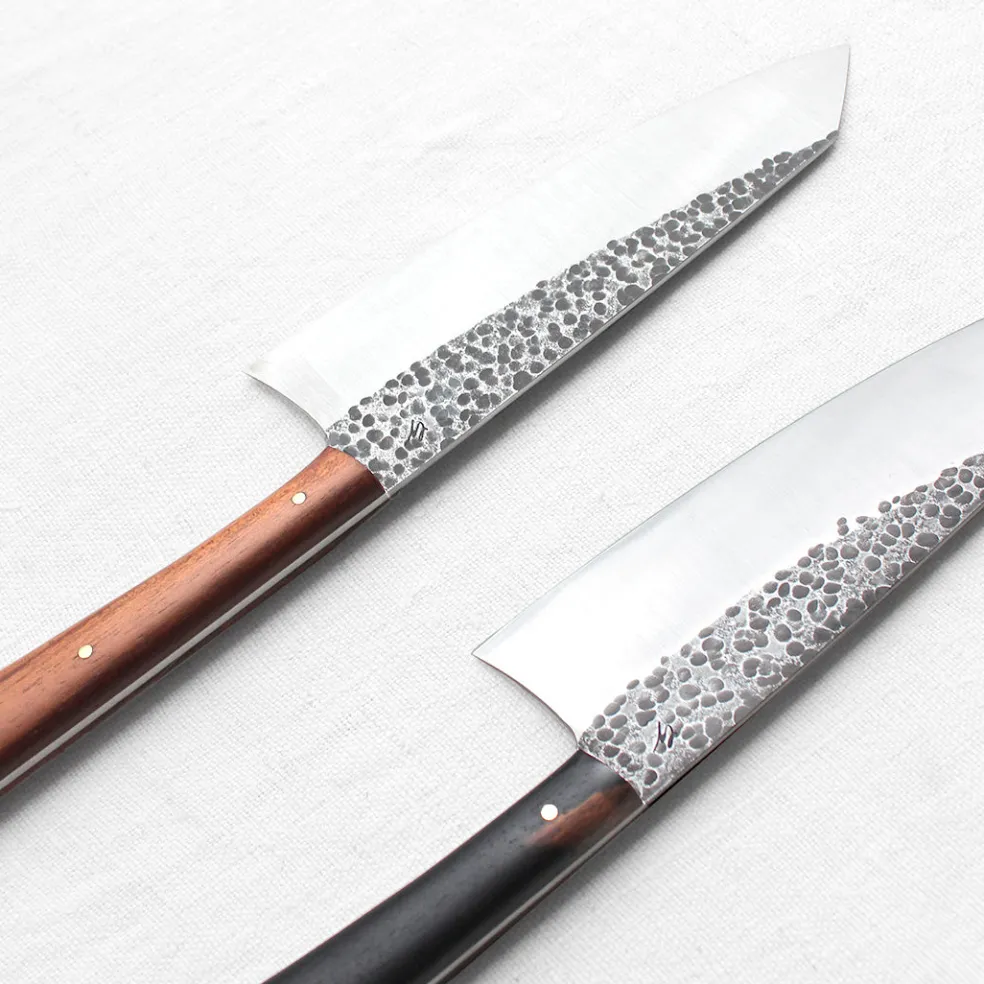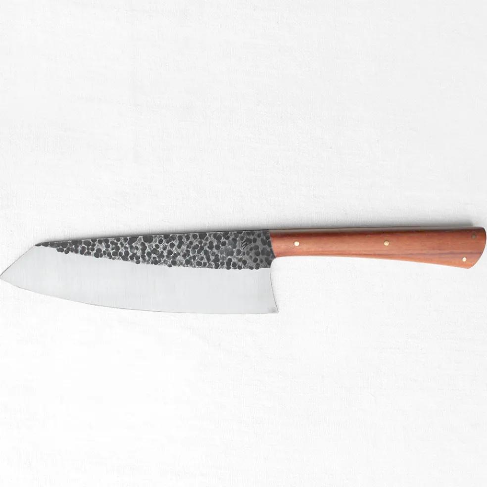 Couteau d’exception, fabriqué artisanalement à l’atelier Miguel dans la région de Perpignan. Sa lame martelée de 2,5mm d’épaisseur est en inox Z40 trempé ; son manche est assemblé par des rivets en laiton. Sa taille est idéale pour la plupart des préparations : ciseler, découper, couper et hacher légumes, poissons et viandes.