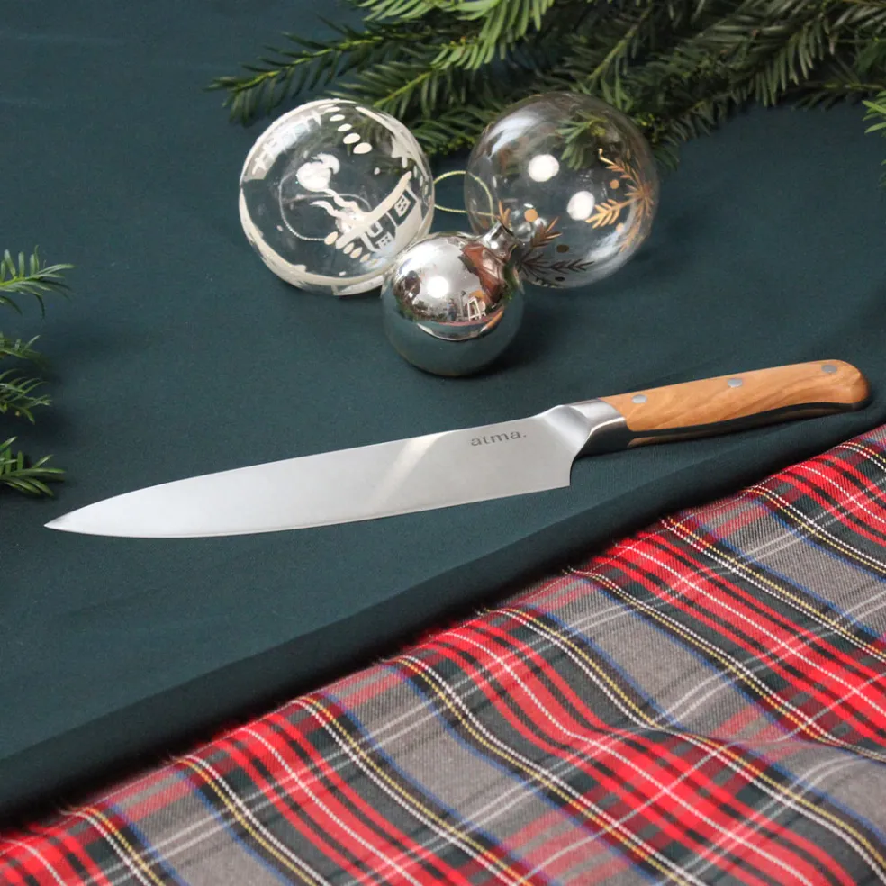 Le couteau de chef de la marque Atma en acier forgé assure 90% de vos découpes en cuisine. Avec son tranchant parfait, rien ne lui résiste. Forgé dans l’une des meilleures coutelleries du Portugal, il est votre partenaire idéal pour les découpes quotidiennes.