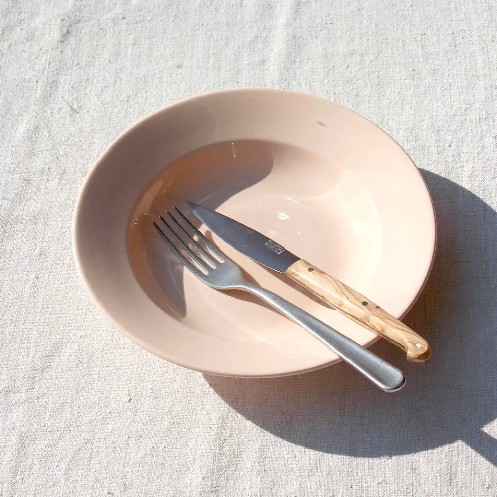 Couteau de table artisanal avec manche en bois d’olivier. Un modèle intemporel doté d’une lame en inox rigide et droite pour une découpe efficace et précise.
