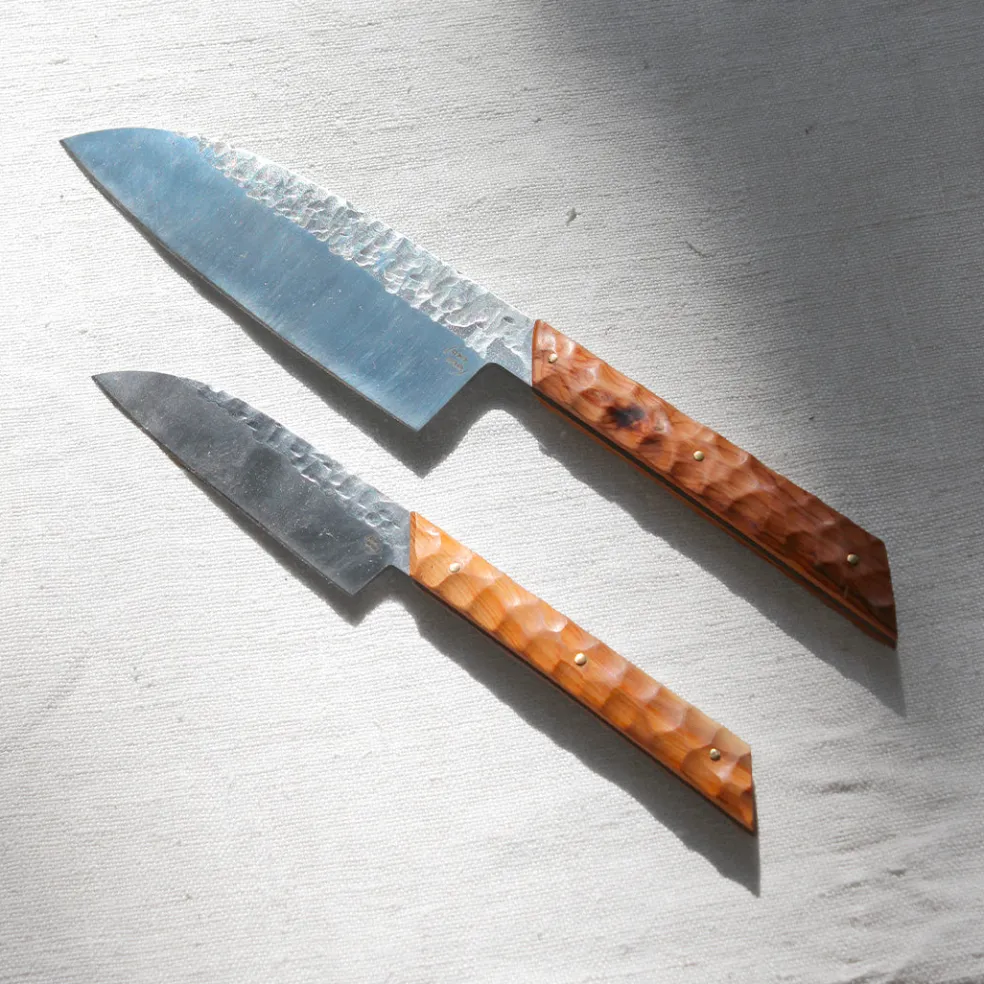 Couteaux de cuisine façonnés à la main dotés d’une lame texturée en inox trempé. Le couteau de chef sert à toutes les découpes du quotidien tandis que le couteau d’office, plus petit, permet une découpe très précise et soignée. Leur manche est sculpté dans un bois d’if.