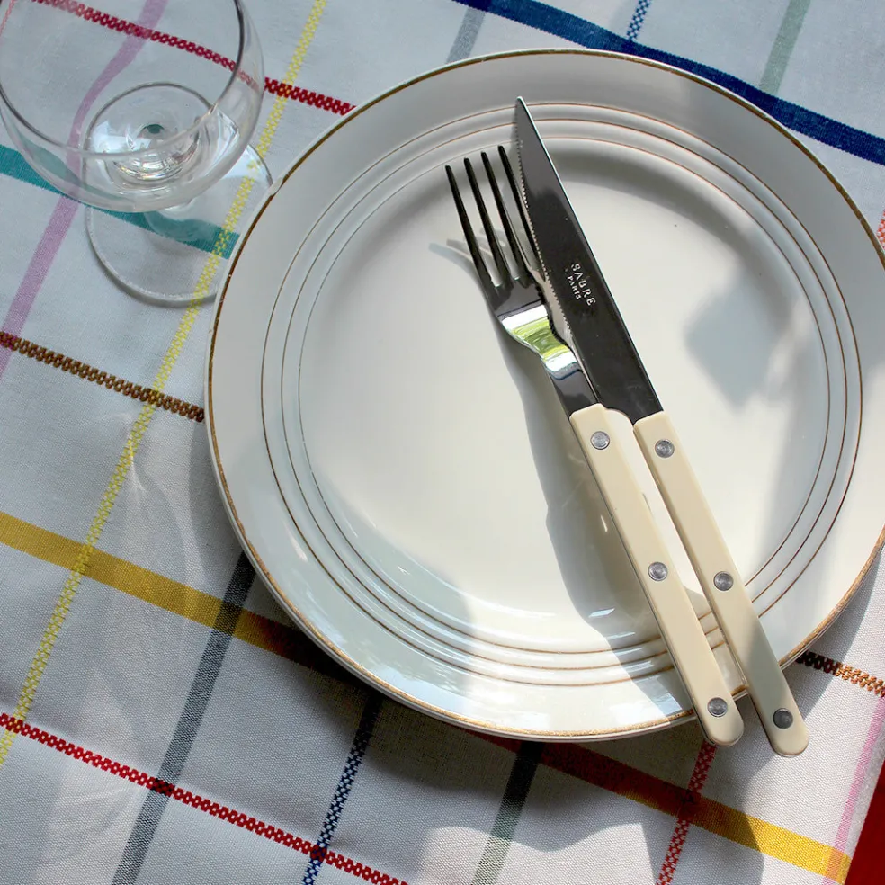 Des couverts en inox dotés de manches d’un beige « mastic » sobre et élégant, avec rivets, dans un style bistrot. On les adopte car ils sont complètement intemporels et s’accordent à la fois avec une vaisselle moderne et ancienne.