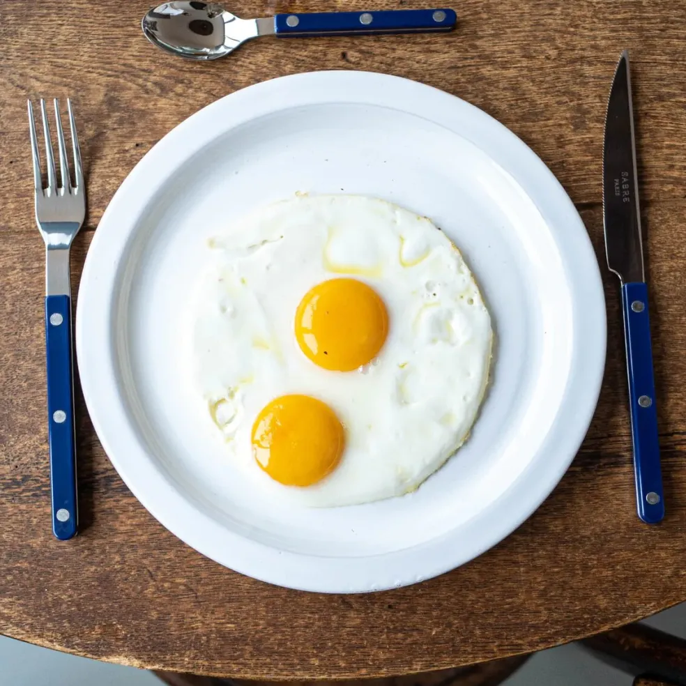Des couverts en inox dotés de manches d’un bleu marine éclatant, avec rivets, dans un style bistrot. On les adopte car ils sont complètement intemporels et s’accordent à la fois avec une vaisselle moderne et ancienne.