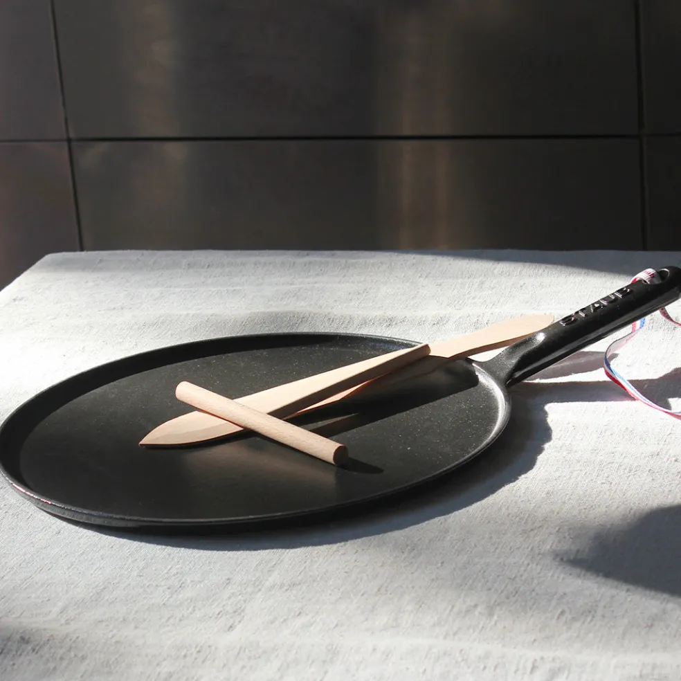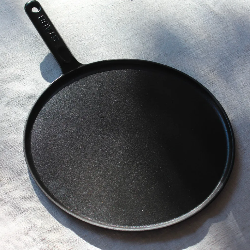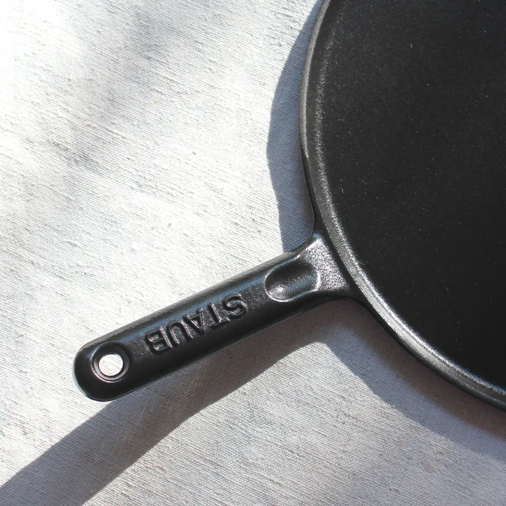 Grande crêpière en fonte émaillée avec poignée. L’intérieur émaillé noir résiste aux rayures. Compatible avec tous les types de feux (gaz, électrique, vitrocéramique et induction).