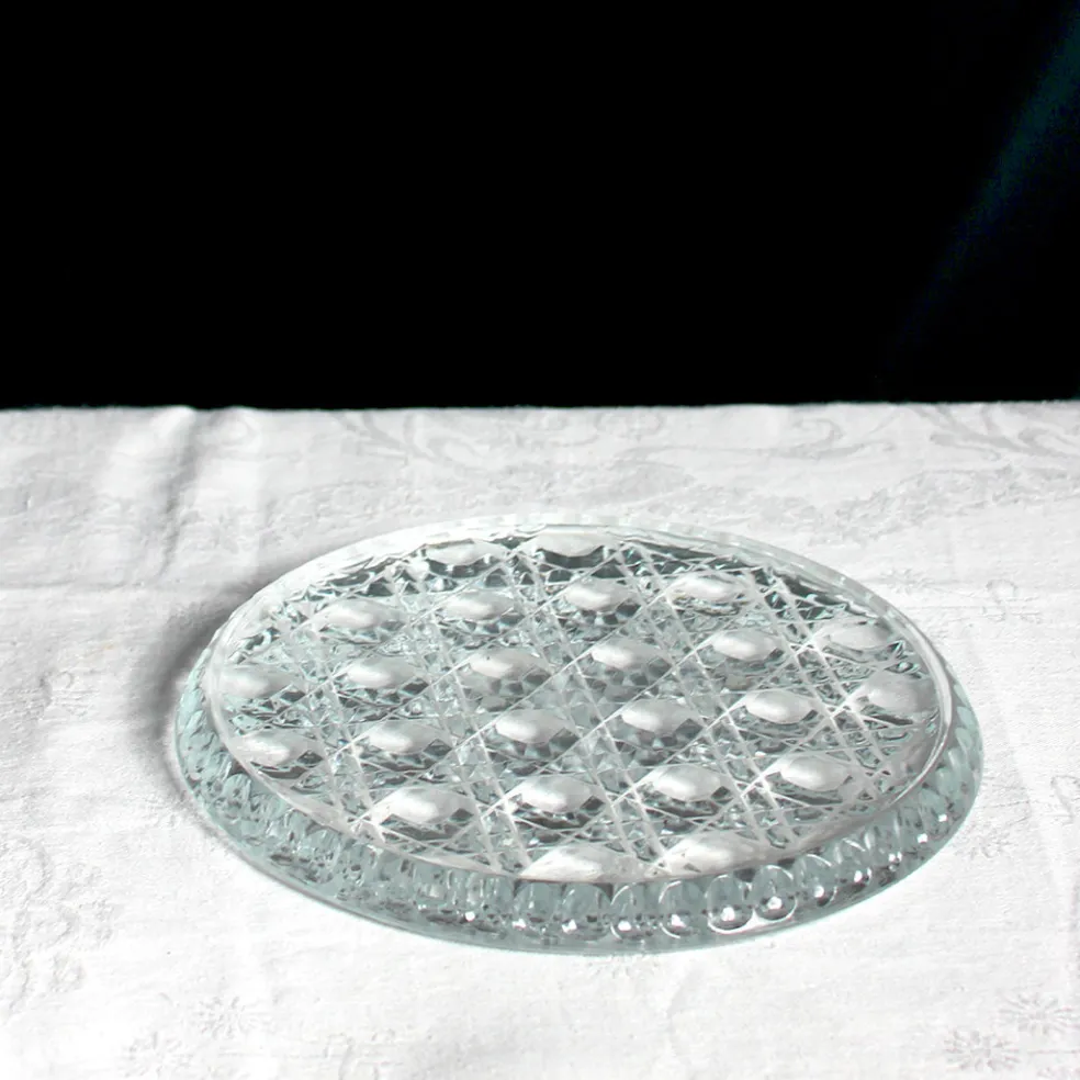 Un dessous de plat intemporel en verre ciselé aux jolis motifs facettés. Une belle lourdeur.