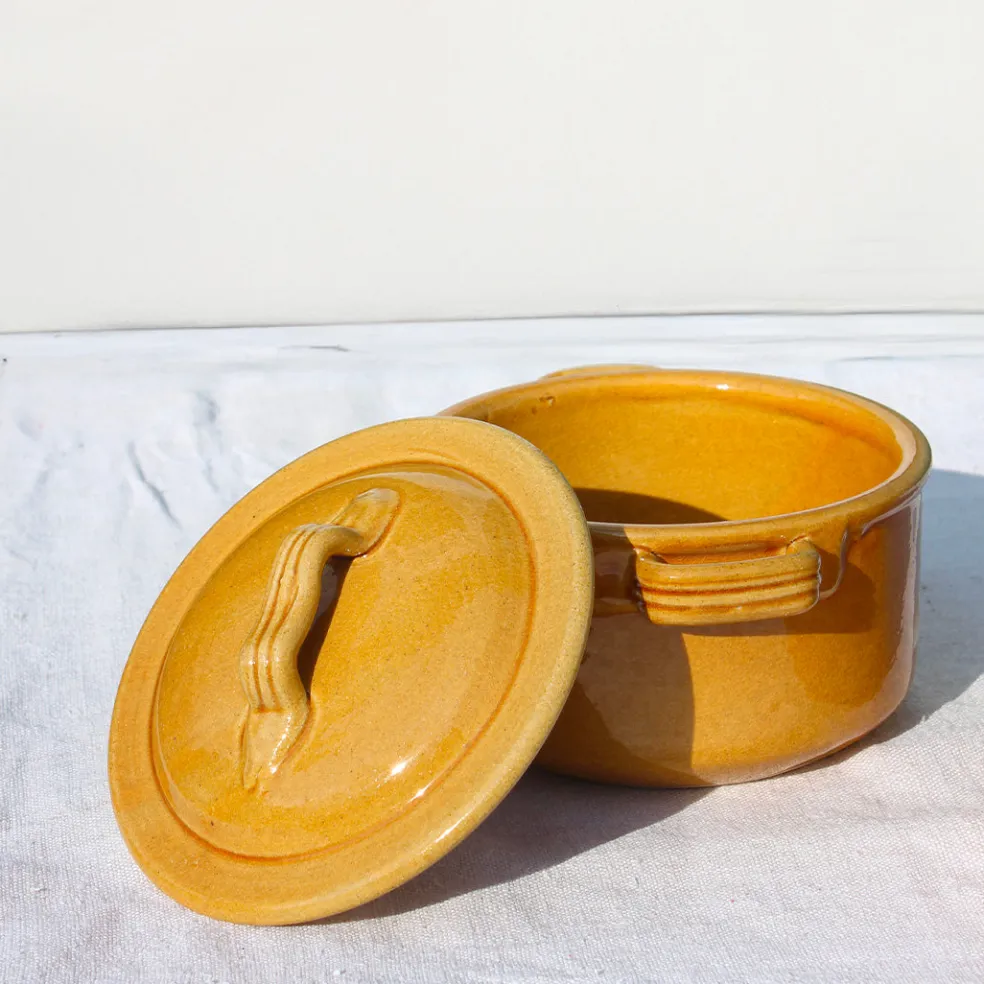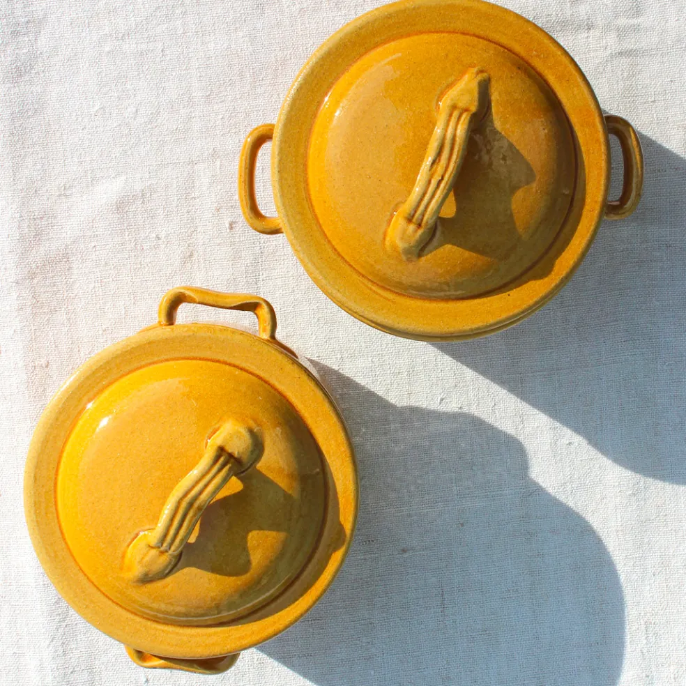 Un duo de petites casseroles dans un style rustique, d’une belle couleur ocre pour cuire au four et servir un plat chaud.