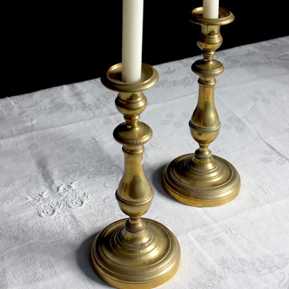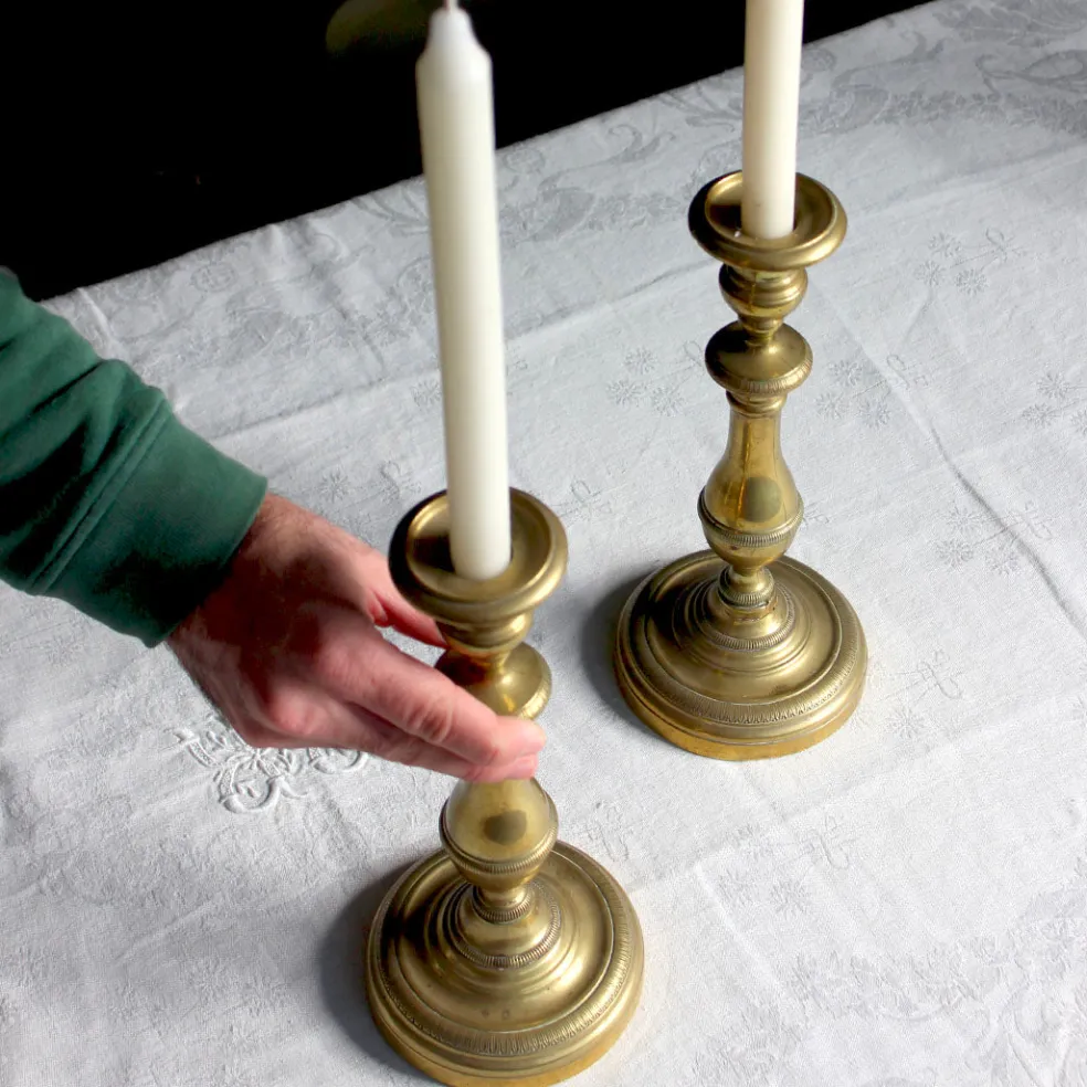 Paire de chandeliers traditionnels en laiton ancien. Un beau détail central sur une table de fête pour une lumière tamisée.