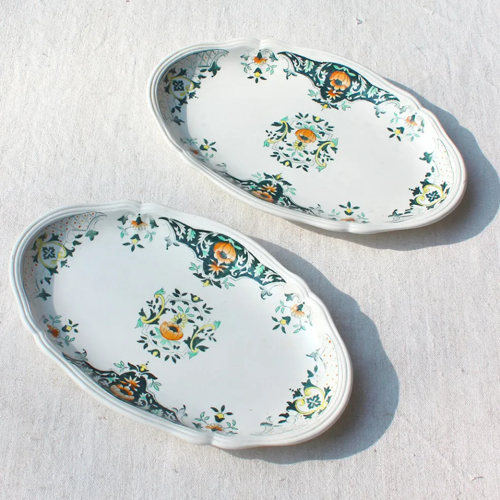 Duo de grands raviers en faïence blanche décorée de volutes et fleurs vert et orange.