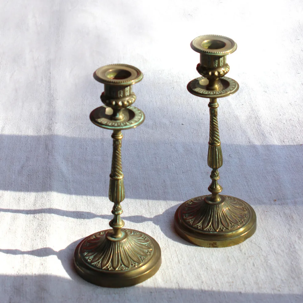 Paire de chandeliers traditionnels en laiton ancien. Un beau détail central sur une table de fête pour une lumière tamisée.