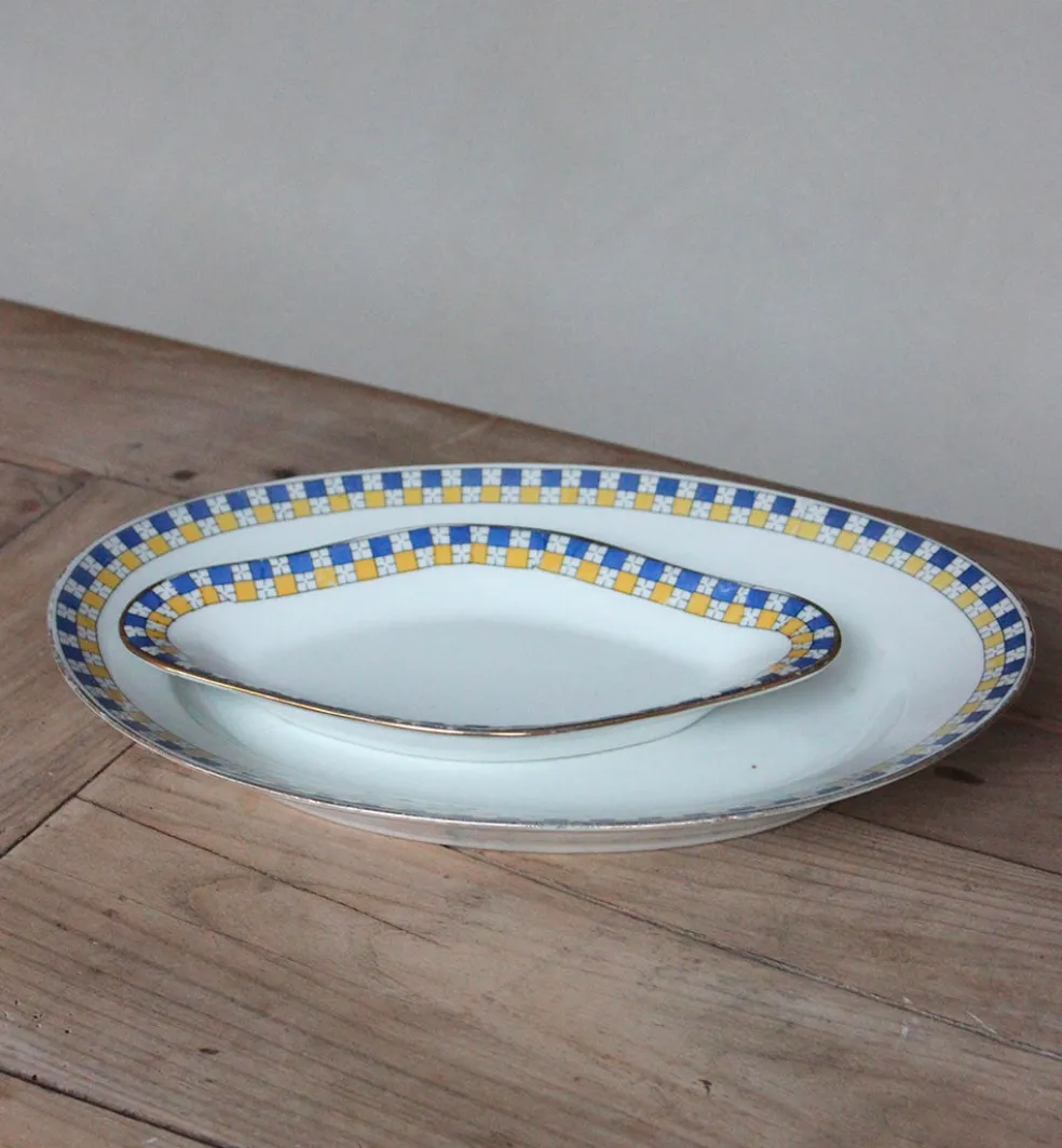 Un plat de service ovale et son ravier assorti en porcelaine de Limoges. Un délicat damier jaune et bleu borde ce modèle art déco. Le duo est vendu à 32 euros.