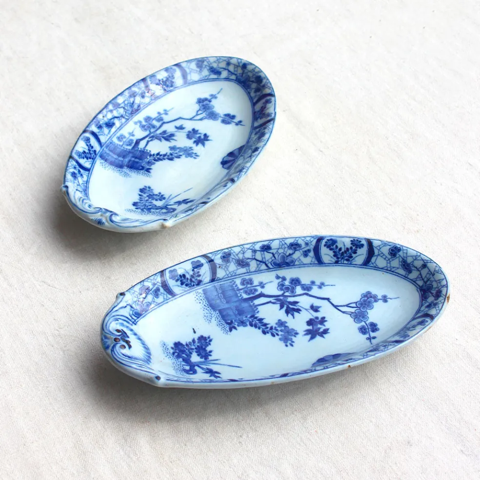 Un duo de raviers d’exception en faïence fine au décor de haies fleuries et pruniers en camaïeu de bleus. Modèle « Japon » emblématique de la faïencerie Creil et Montereau.