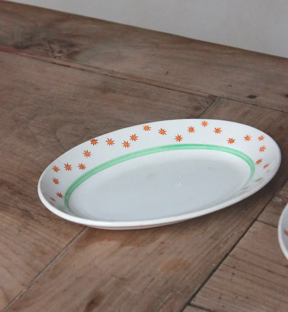 Duo de raviers en faïence de Gien décorés de quelques étoiles. Pratiques pour servir des apéritifs ou accompagnements. Des pièces du même modèle Marie France sont disponibles sur notre site.