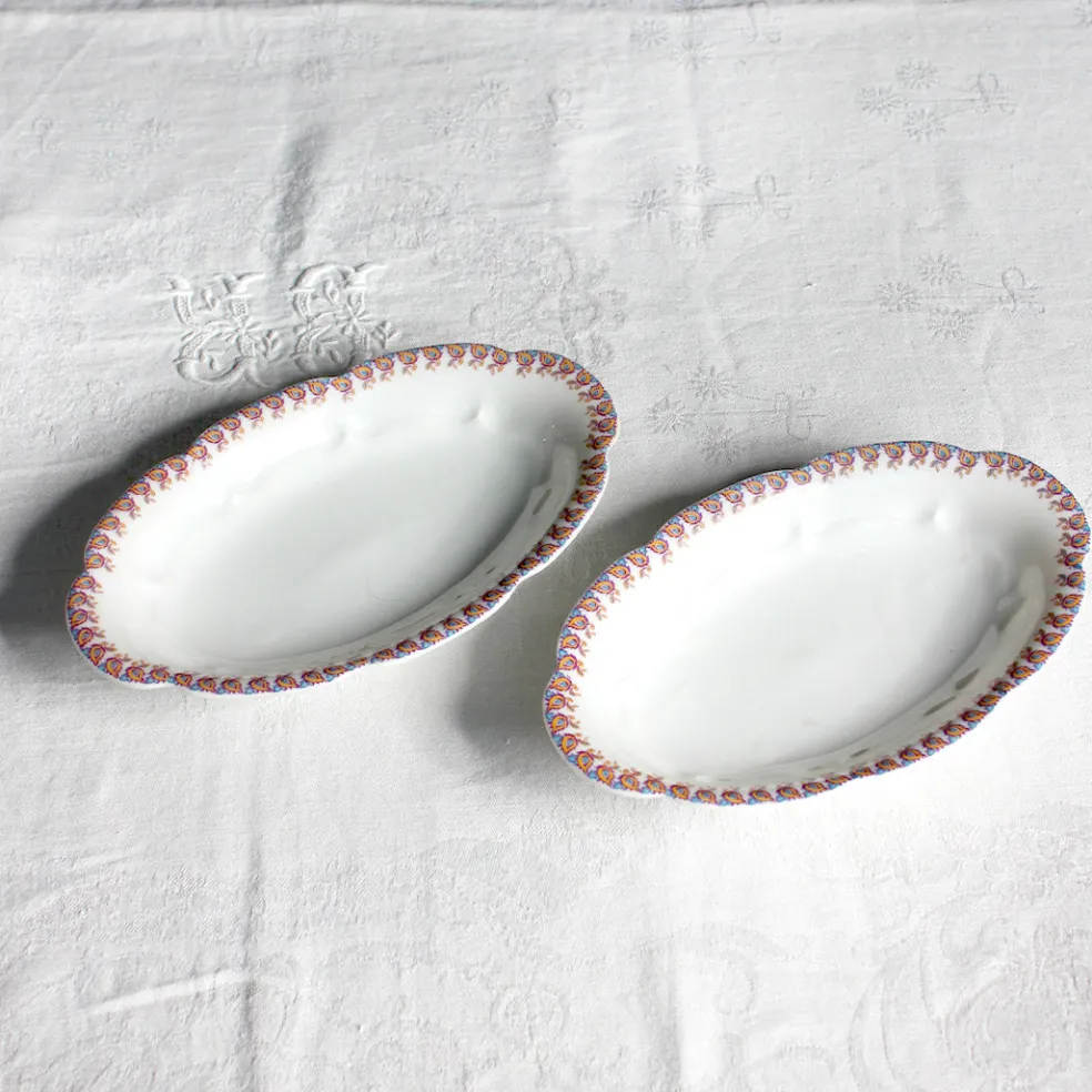 Duo de raviers en porcelaine blanche, les bords sont légèrement mouvementés et décorés d’une fine frise colorée. Un modèle en édition limitée créé pour les grands magasins de Châteauroux.