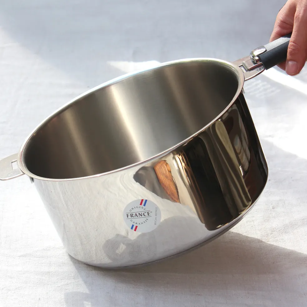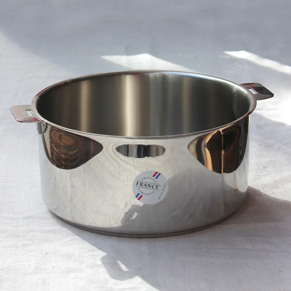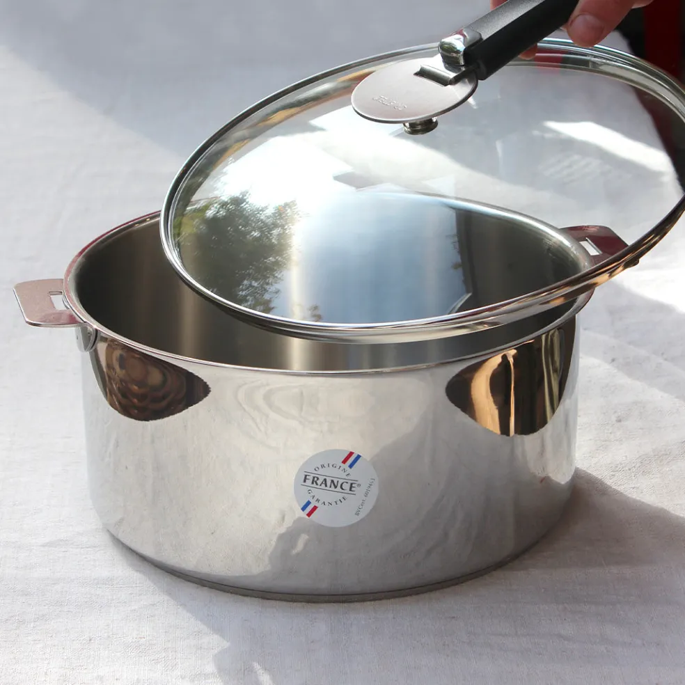 Faitout en inox 18/10 de la gamme Mutine de l’excellente maison Cristel. Pratique avec sa poignée amovible, Il possède deux anses avec une belle finition brillant miroir et un couvercle en verre bombé (en option). Compatible avec tous les feux, y compris l’induction.