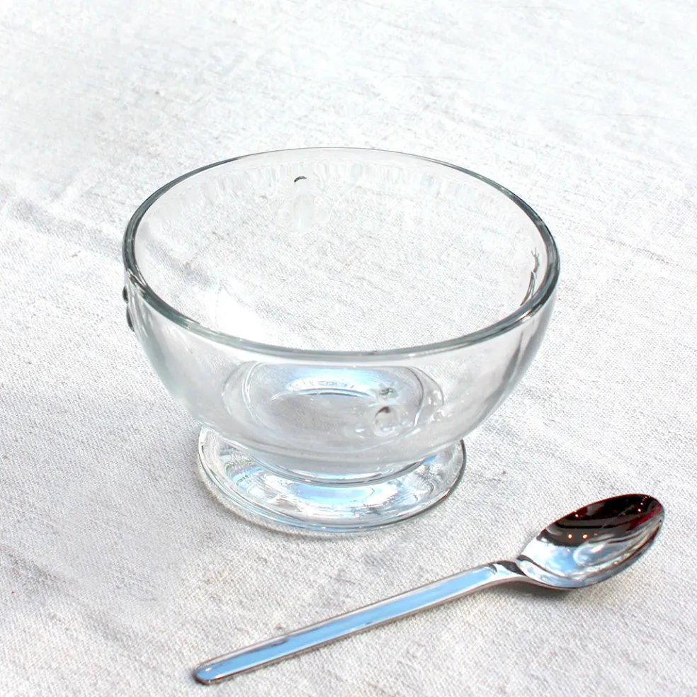 Bol en verre à talon, pratique pour le service d’une boisson chaude ou autre. Joli motif d’abeilles en relief sur le contour, emblématique de la manufacture de la Rochère. Contenance de 60cl.