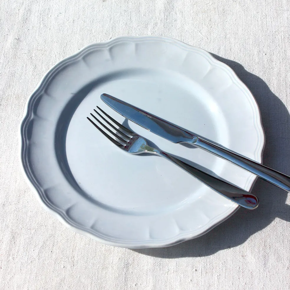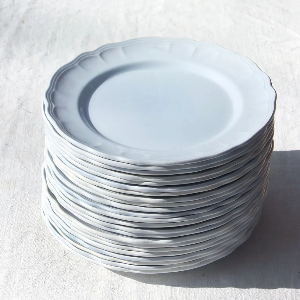 Série de grandes assiettes plates en faïence d’un gris perle tirant vers le bleu clair. Joli mouvement des bords.