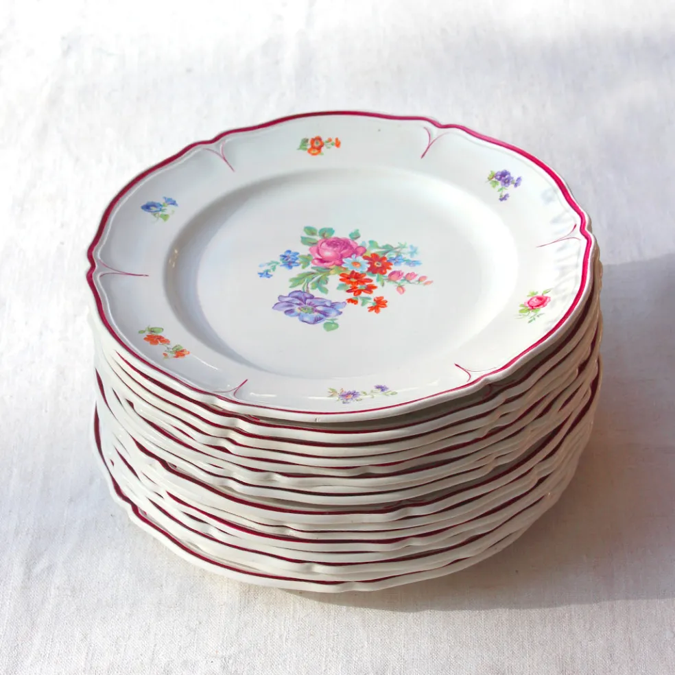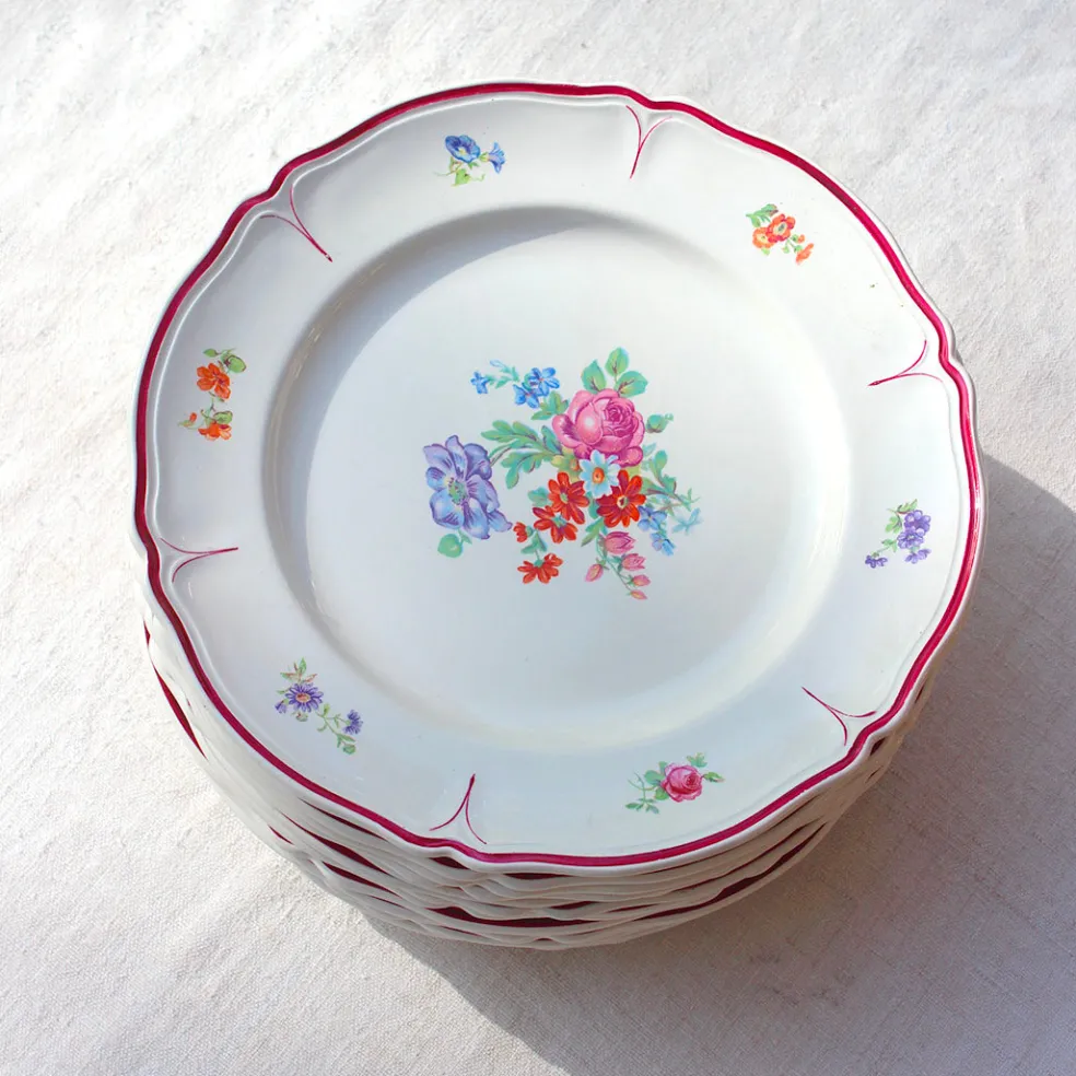 Belles assiettes en faïence ancienne décorées de bouquets de fleurs aux bords mouvementés. Un modèle joyeux et romantique de la manufacture de St Amand.