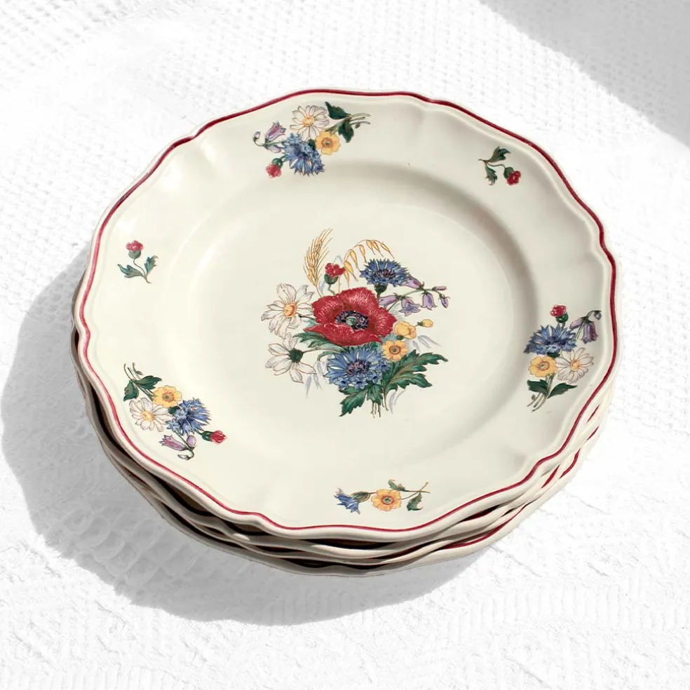 Chaleureux décor composé de bleuets, coquelicots et épis de blé pour ces célèbres assiettes plates Agreste signées Digoin Sarreguemines.
