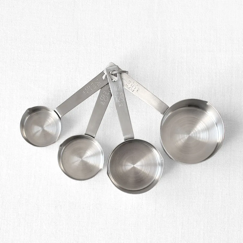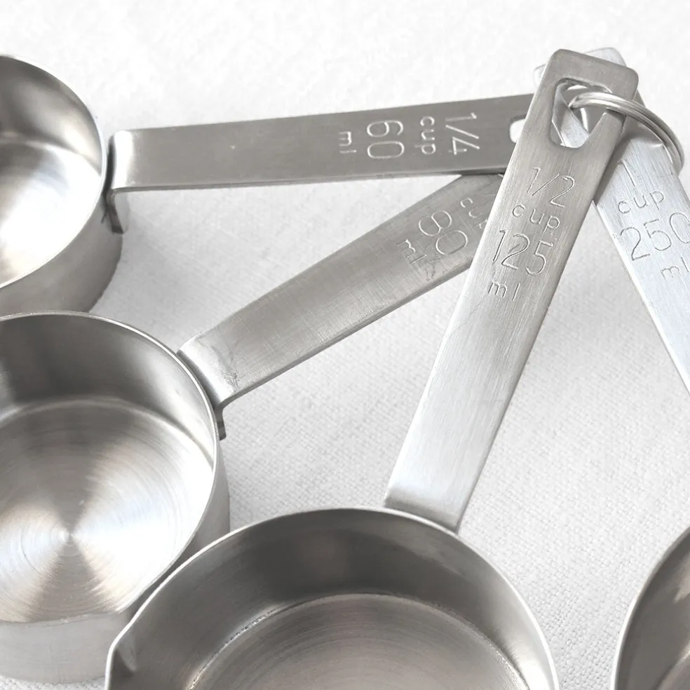 Quatre cuillères à mesure en inox (60ml, 80ml, 125ml, 250ml) permettant un dosage précis lors de vos recettes. Détail pratique : pour les recettes américaines, les cuillères possèdent l’équivalent de mesure en nombre de « cups ».