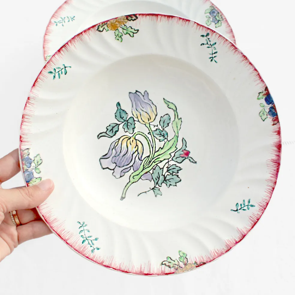 Modèle « Marseillle » de la faïencerie de Longwy pour ces lots de 6 assiettes creuses. Couleurs vives et bords peignés typiques des faïenceries de l’est de la France. Le décor varie d’une assiette à une autre.