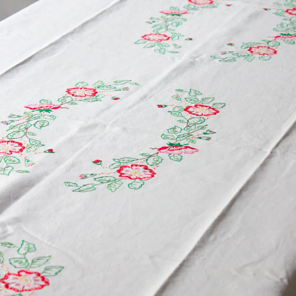 Très belle nappe rectangulaire dans un métis damassé. Belle épaisseur, broderies de fleurs main aux couleurs de Noël.