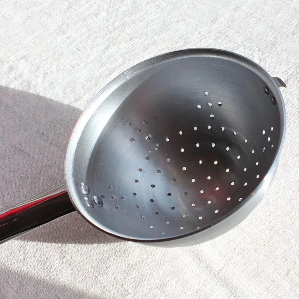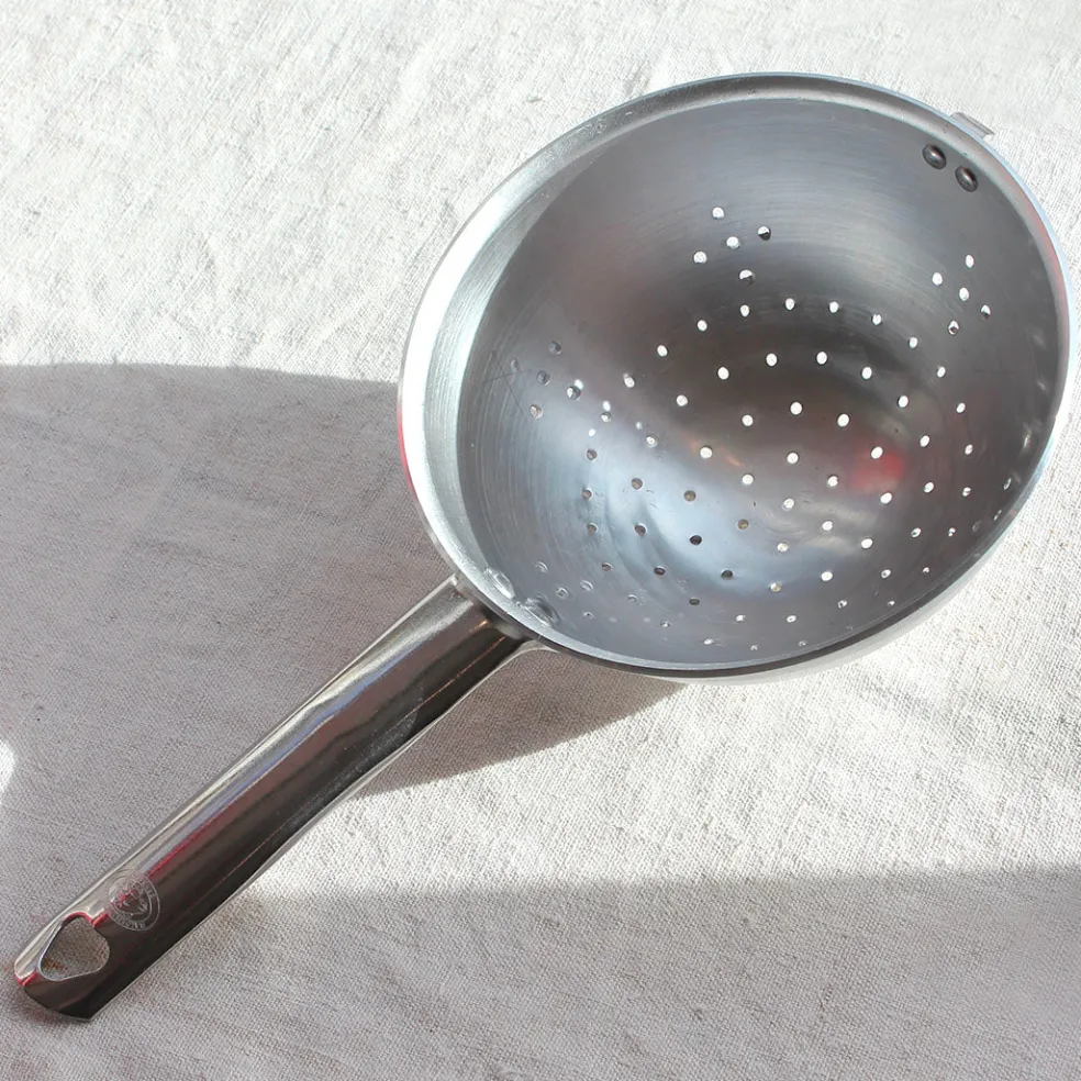 Passoire en aluminium avec manche en inox et crochet de suspension. Un objet du quotidien à l’allure rétro fabriqué en Italie et décliné en trois formats. La plus grande convient à un usage professionnel ou familial.