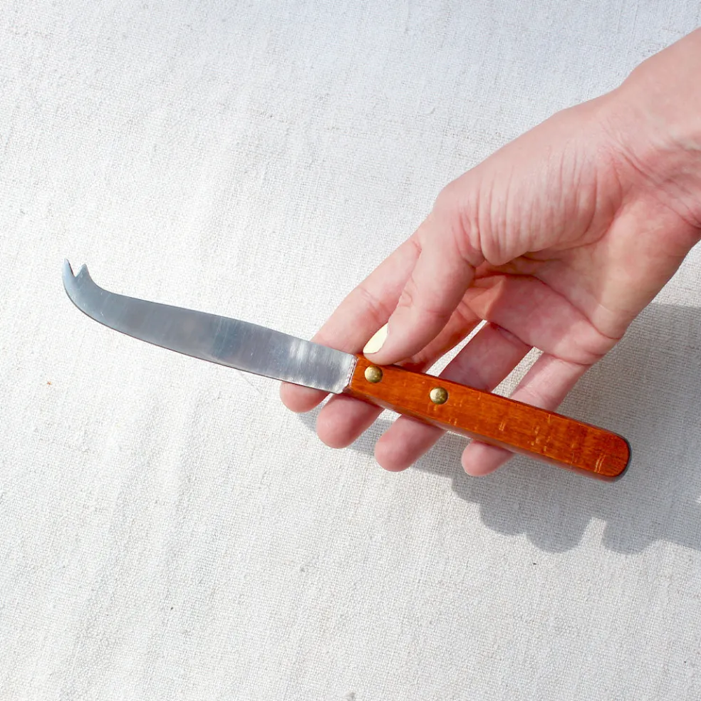 Un couteau à fromage rustique avec un manche en bois de hêtre riveté. Sa petite taille est très pratique pour un usage quotidien.