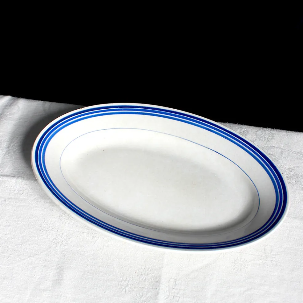 Petit plat ovale cerclé de liserés bleu outremer des années 30. Un modèle de la manufacture Moulin des Loups. Taille adaptée pour servir des chocolats, un petit accompagnement, etc.
