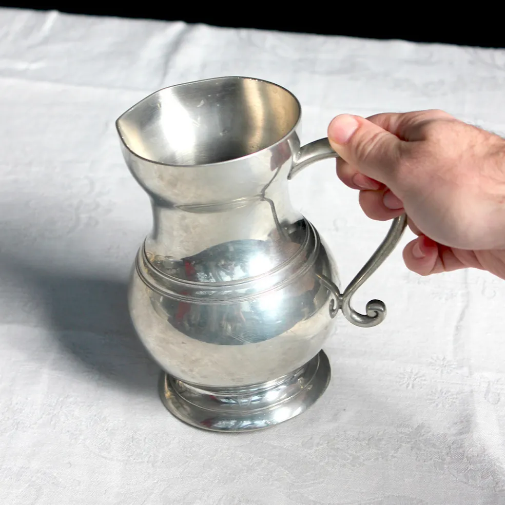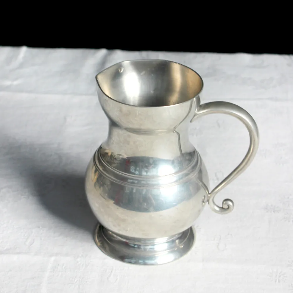 Un très joli petit pichet en étain pour servir de l’eau ou du vin. Peut aussi être détourné comme un vase. Belle épaisseur.