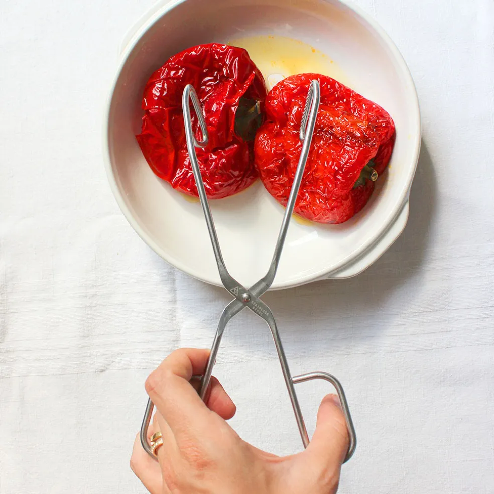 La pince en inox avec un système de boucles comme des ciseaux qui permet une bonne préhension des aliments en cuisine. Elle peut aussi permettre de servir certains plats à table.