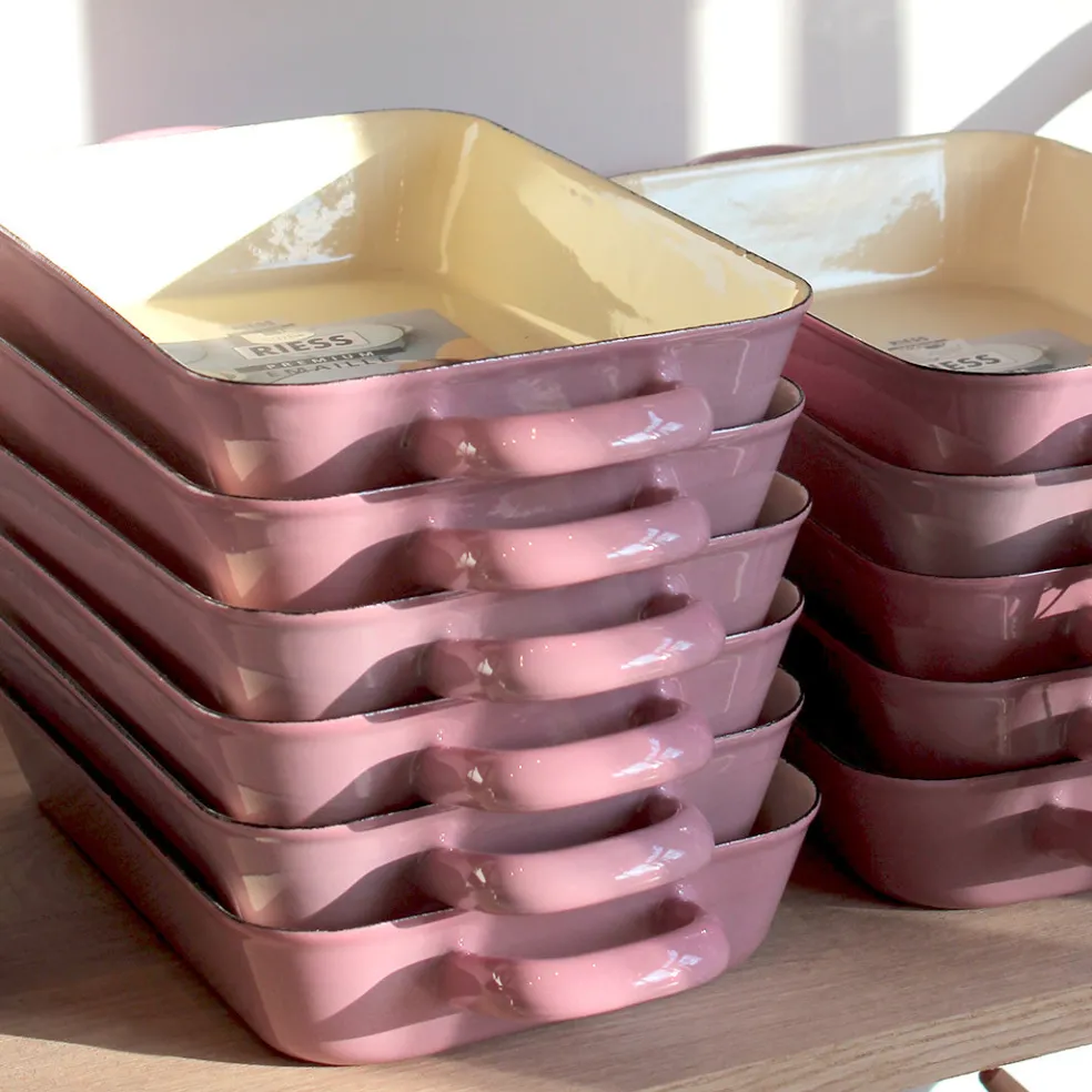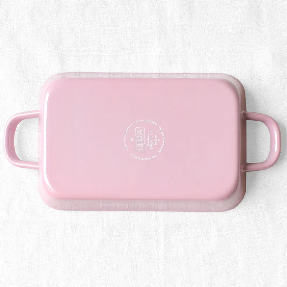 Un joli petit plat en émail rose clair pour cuire et servir des gratins, lasagnes ou crumbles.