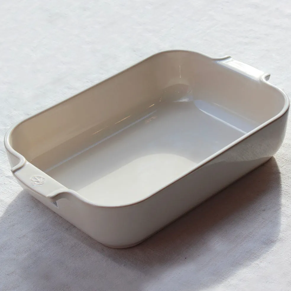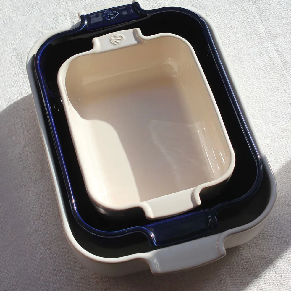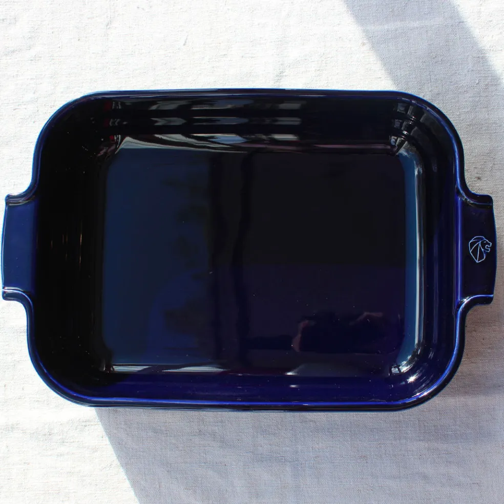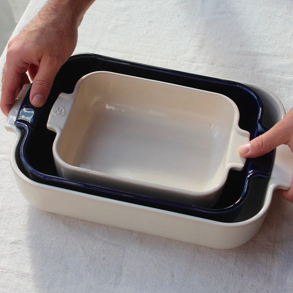Plat à four rectangulaire de la célèbre marque Peugeot. Un format pratique et profond pour préparer des lasagnes, gratins, viandes et légumes au four. Décliné en écru ou bleu profond.