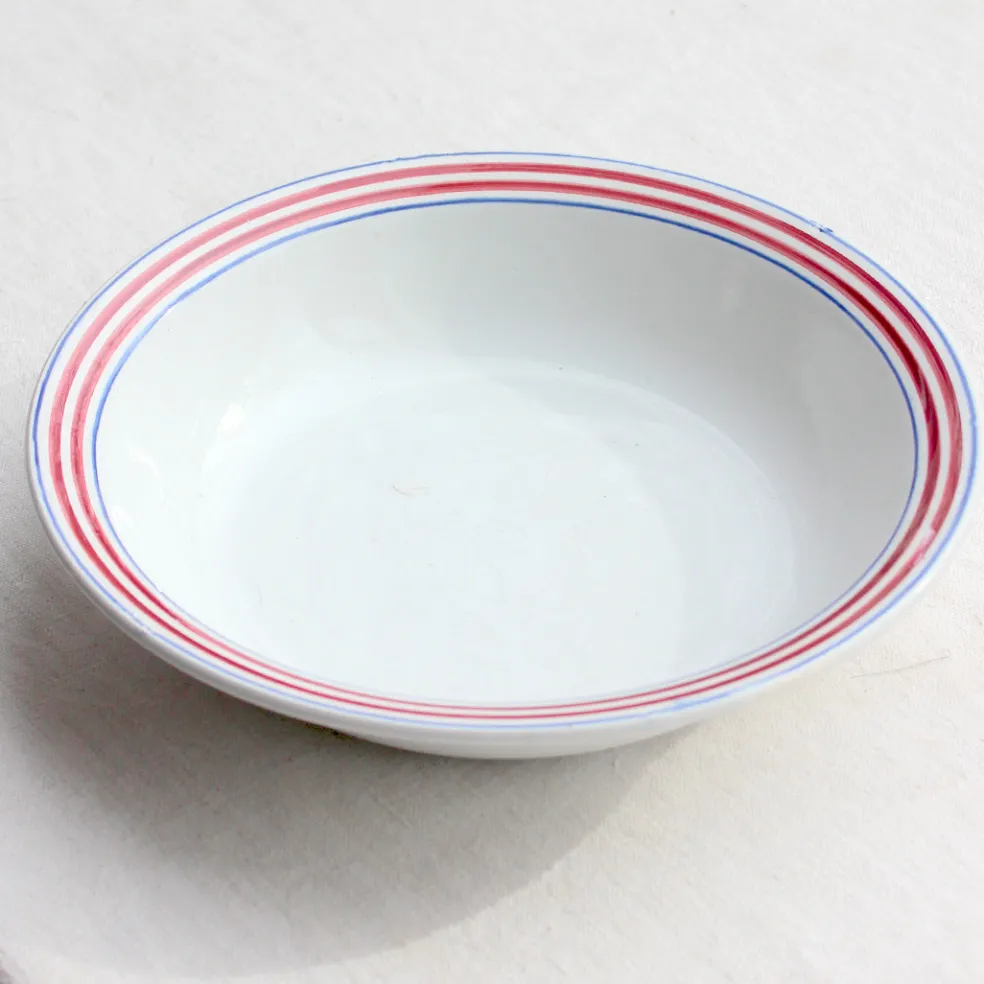 Petit plat creux en faïence cerclé d’un bandeau de rayures bleu et rouge, de Saint Amand. Un format très pratique au quotidien, sobre et élégant.