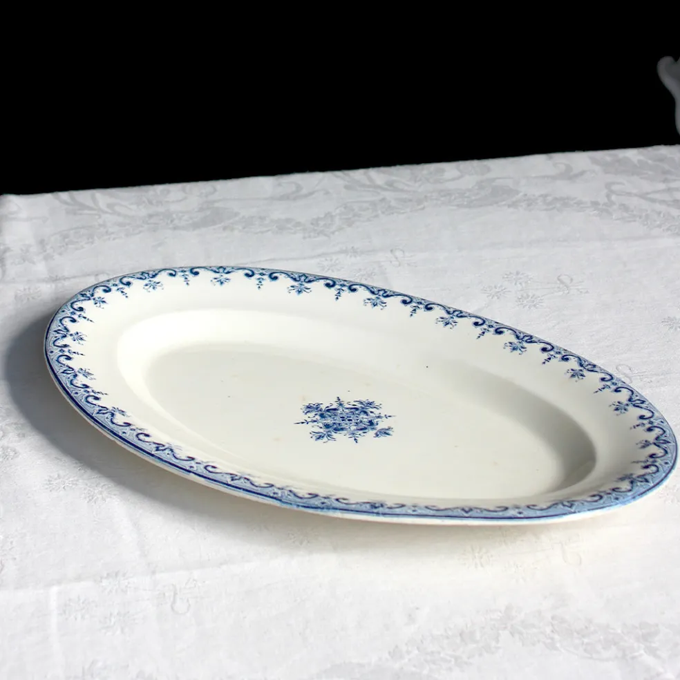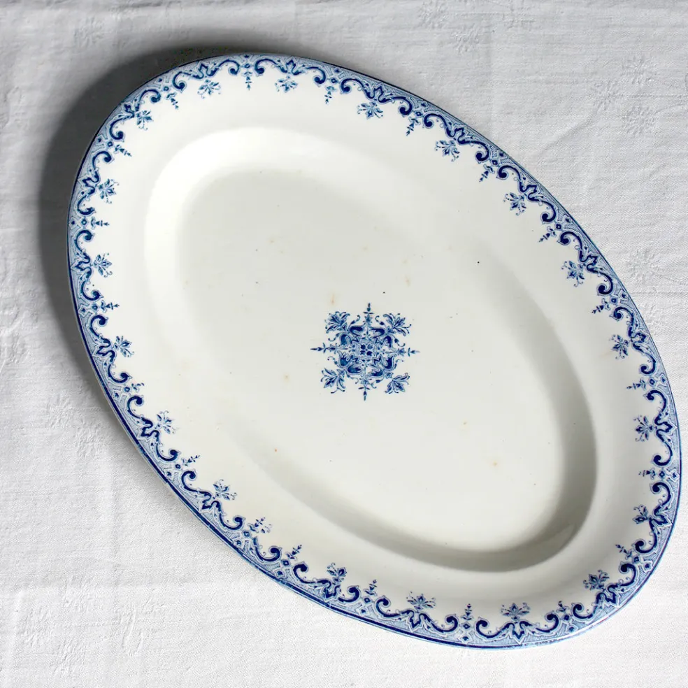 Plat ovale orné d’une frise aux volutes bleu marine de la manufacture de Clairefontaine. L’estampille « LG », indique que le modèle date de la période 1894-1913.