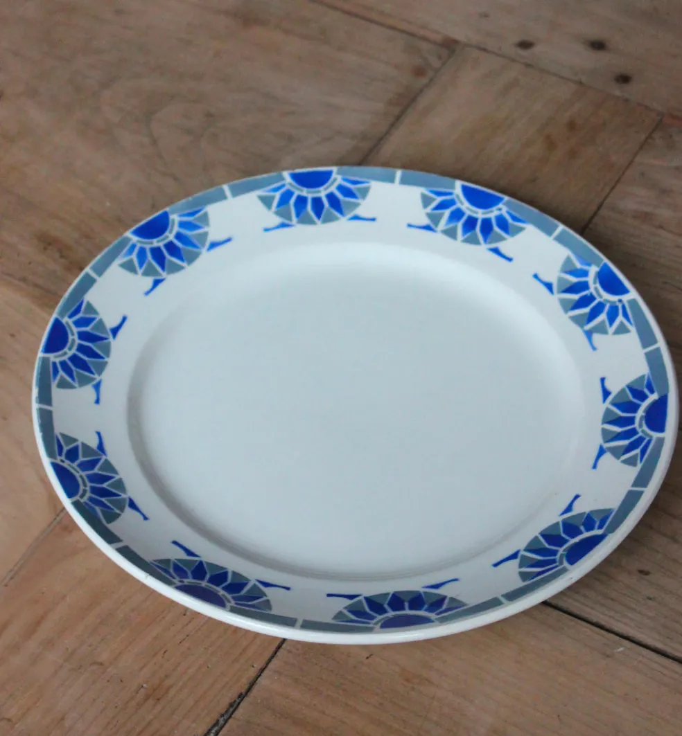 Plat rond décoré de motifs graphiques bleu outremer. Modèle Roxy de saint Amand.