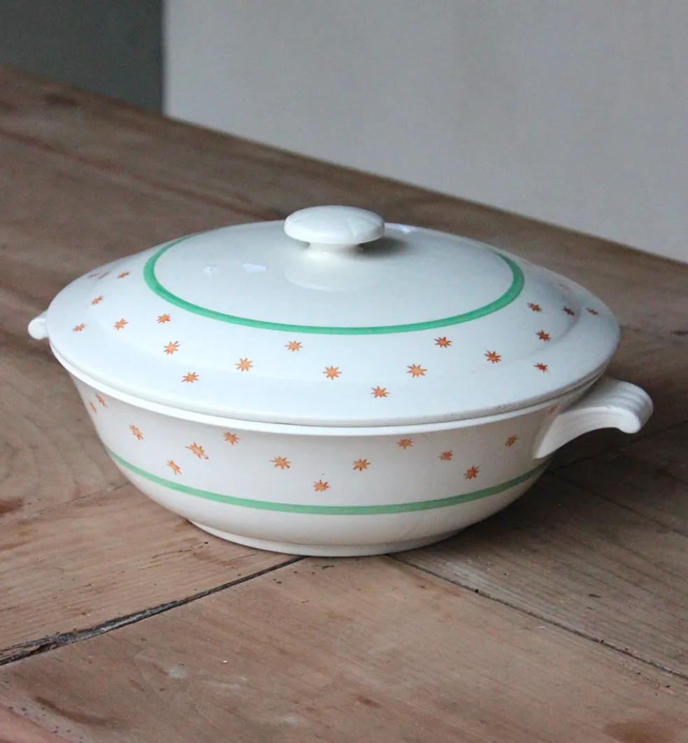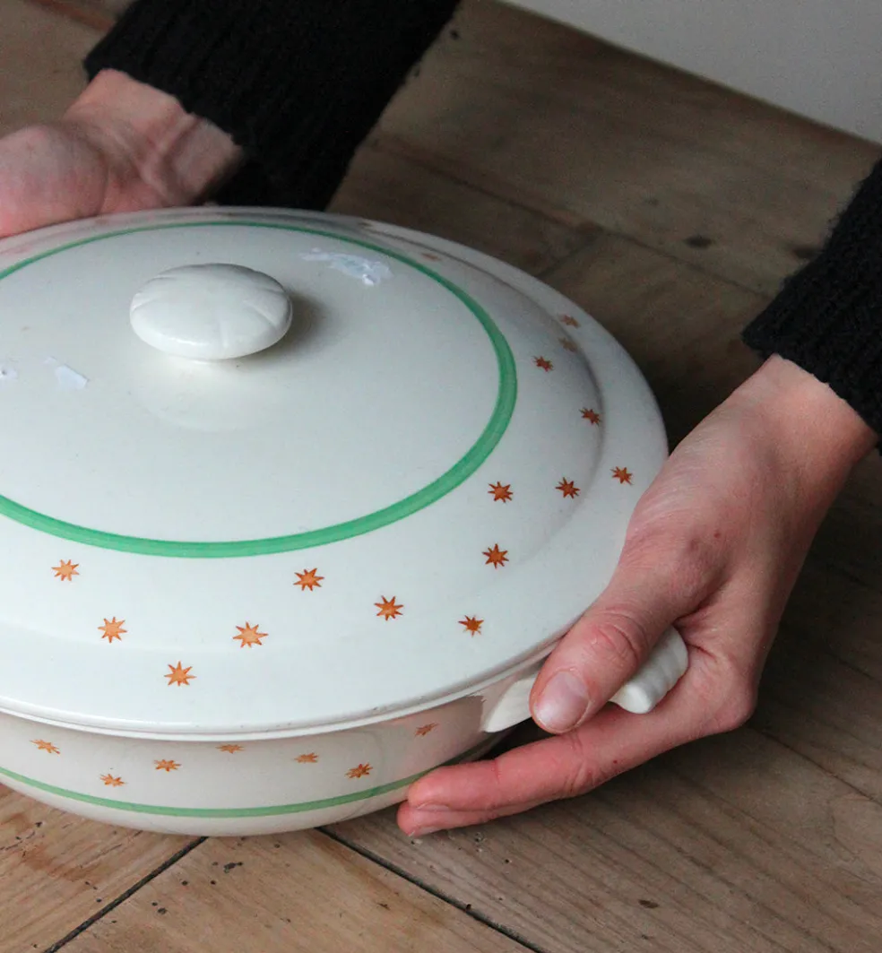 Plats de service en faïence de Gien décorés de quelques étoiles. Des pièces du même modèle Marie France sont disponibles sur notre site.