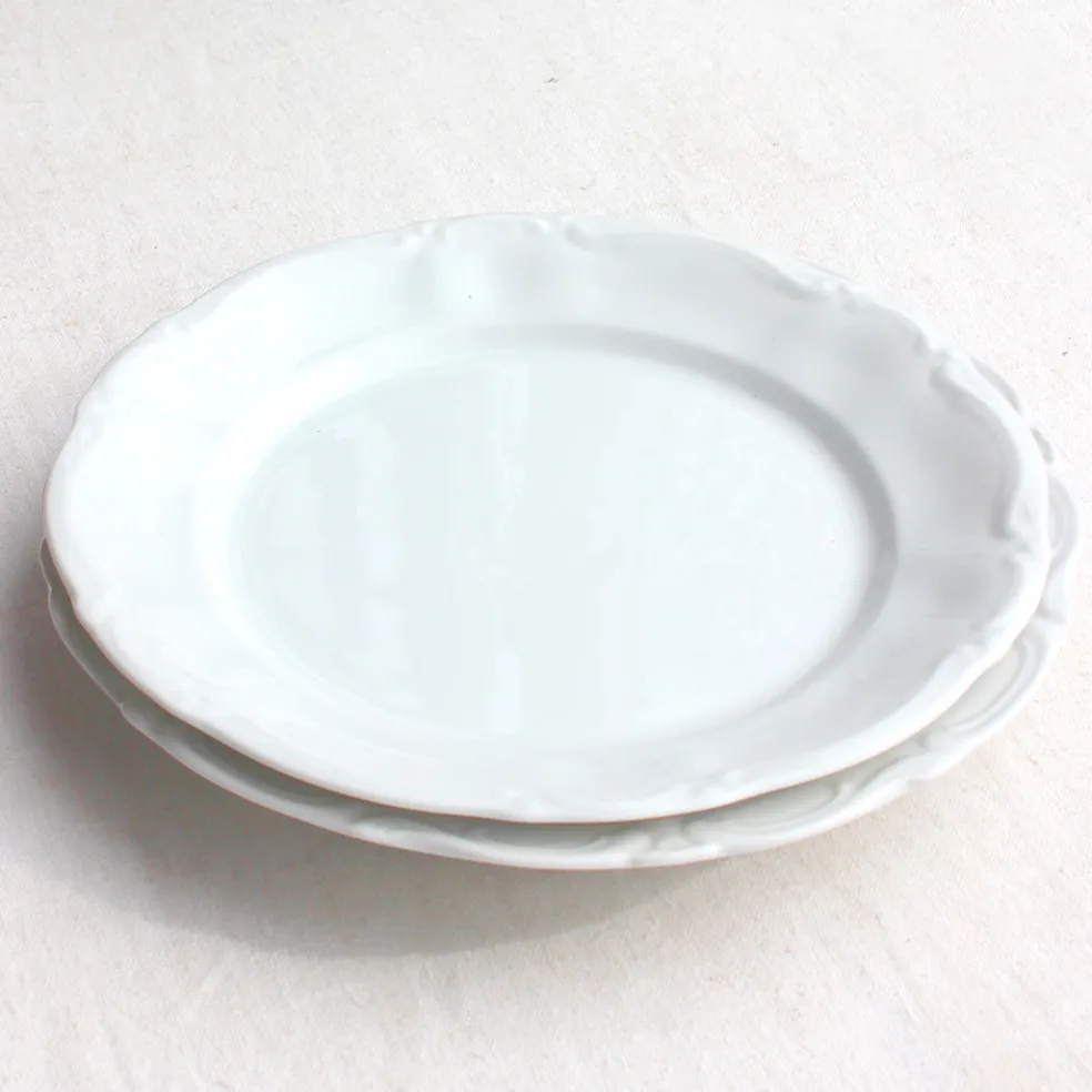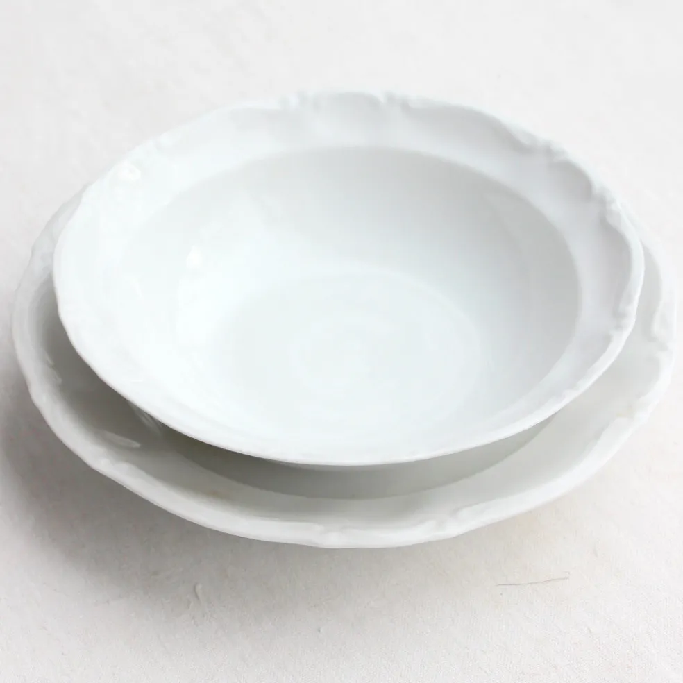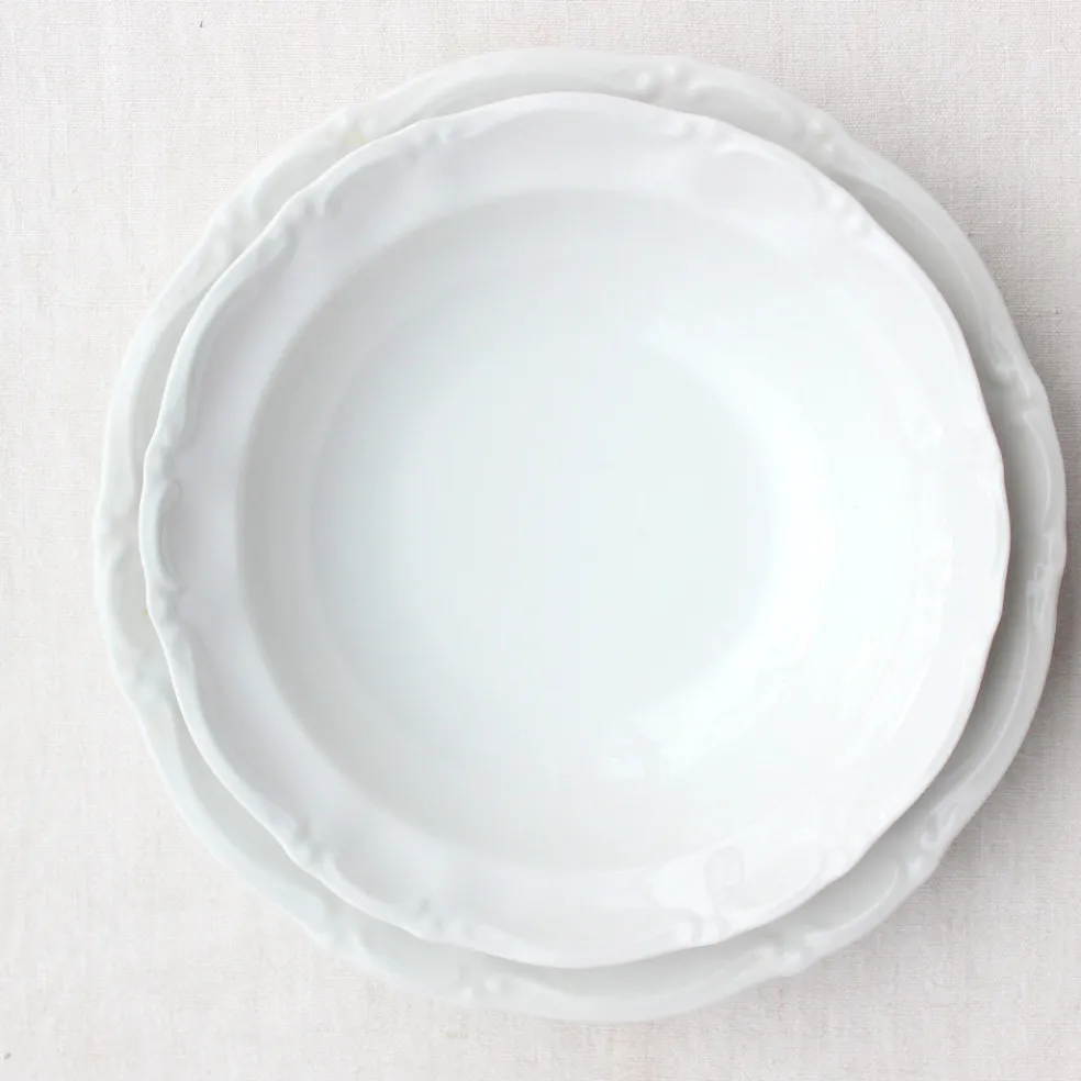 Des plats de service en porcelaine blanche allemande aux bords mouvementés. Un modèle intemporel et élégant qui fonctionne très bien pour une table de fête.