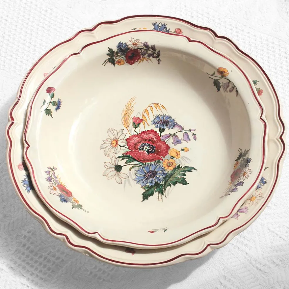 Chaleureux décor composé de bleuets, coquelicots et épis de blé sur fond crème. Ce célèbre décor Agreste est signé Digoin Sarreguemines. Desassorties sont disponibles.