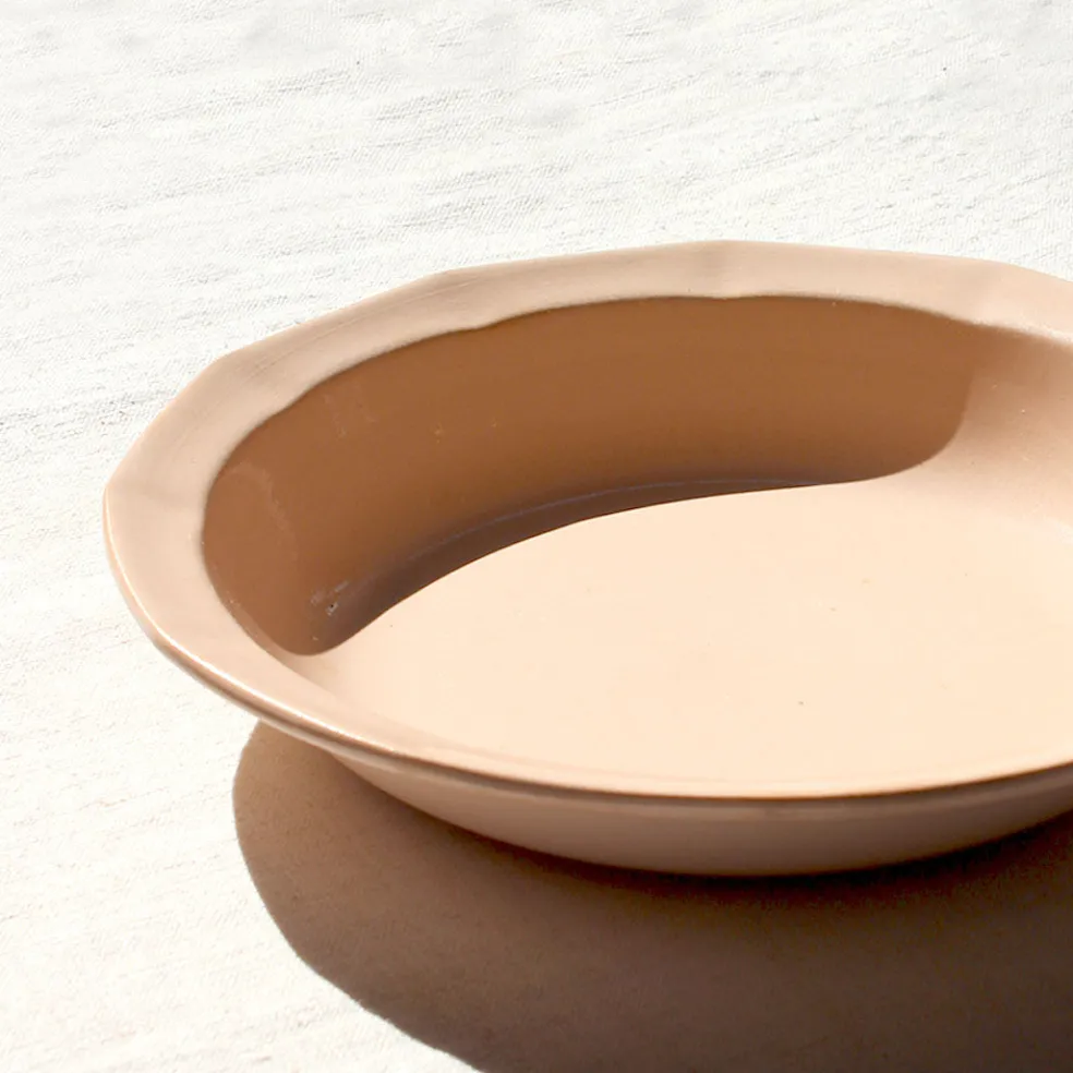 Plats de service rose poudré au grain typique de la faïence des années 50. Des assiettes, plates, creuses et à dessert sont également disponibles sur notre site.