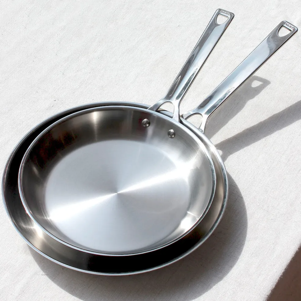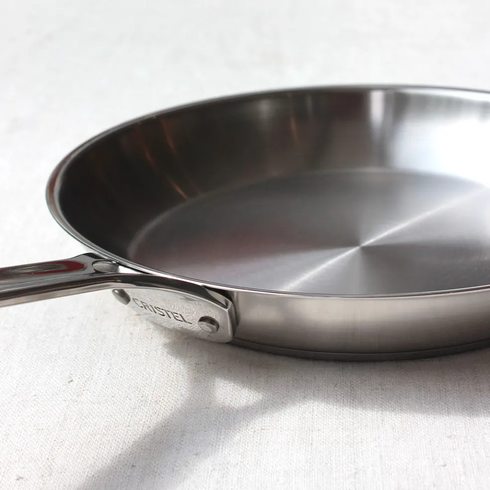 Une poêle en inox 18/10 avec un manche fixe riveté du modèle 1826, entrée de gamme de l’excellente maison Cristel.