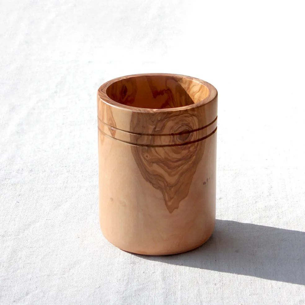 Un magnifique pot taillé dans une pièce d’olivier massif pour mettre spatules, cuillères et autres ustensiles de cuisine.