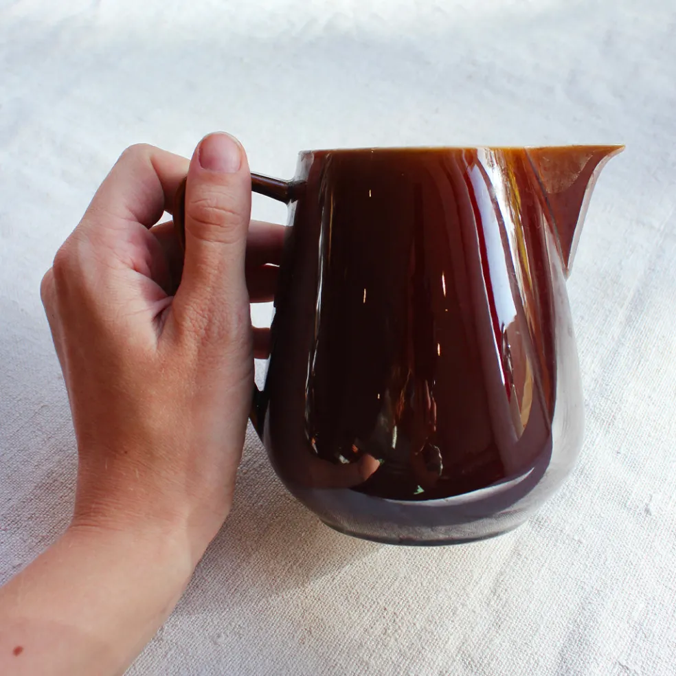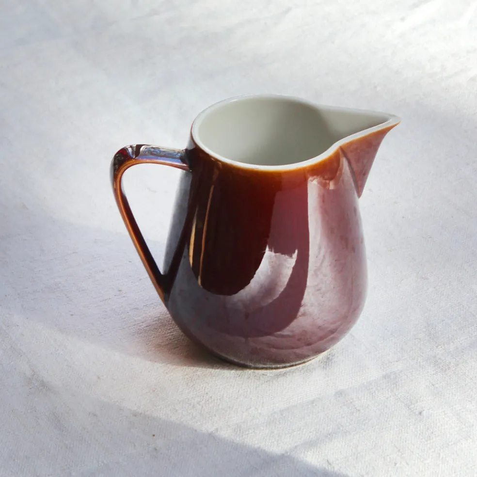 Une glaçure brune typique des années 70 pour ce pot à lait n°3 de la manufacture Villeroy and Boch. Charmant détail bistrot pour servir du lait ou une boisson chaude.