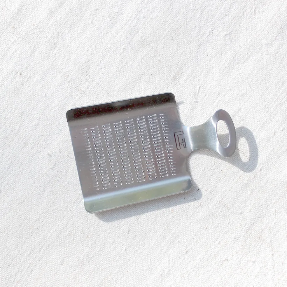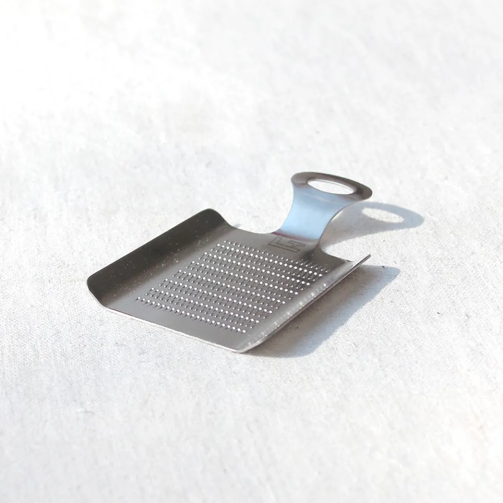 Une toute petite râpe en inox qui permet de réduire en purée l’ail et le gingembre facilement. Elle peut aussi servir pour des épices comme la muscade et le citron noir.