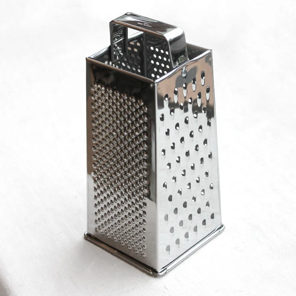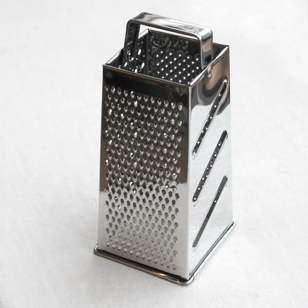 Une râpe de cuisine manuelle à quatre faces multifonctions, qui peut donc servir à la fois de râpe légumes et de râpe à fromage. Elle est constituée d’une face « gros grain », d’une face « grain moyen », d’une face « grain fin » et d’une face « lamelles ».