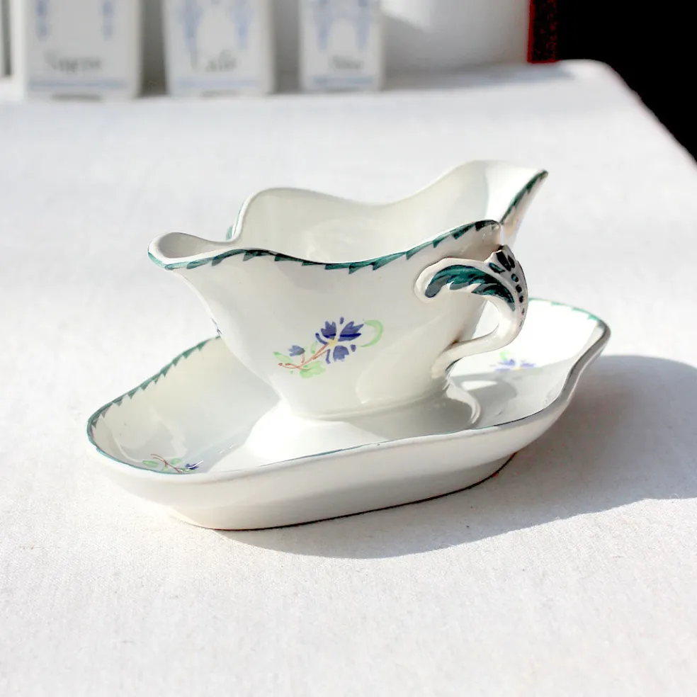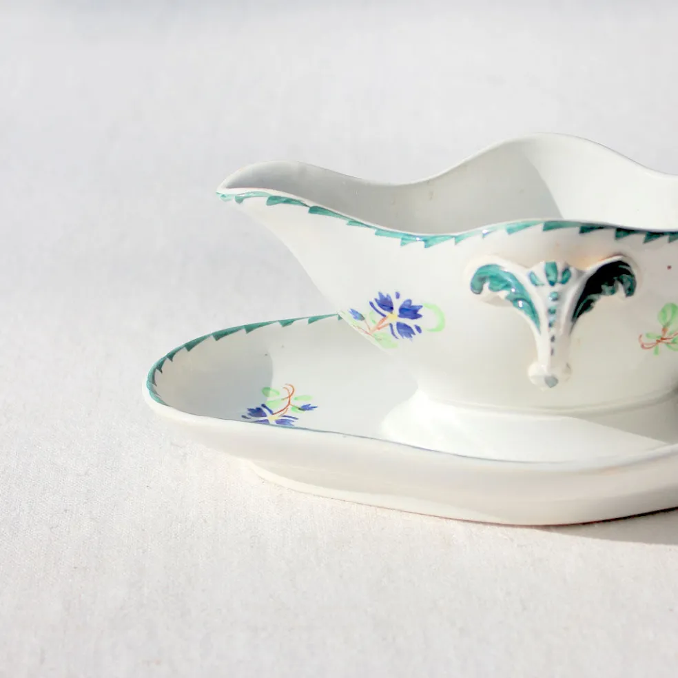 Ambiance printanière avec cette très belle saucière ancienne en terre de fer au décor unique de fleurs bleu et vert.