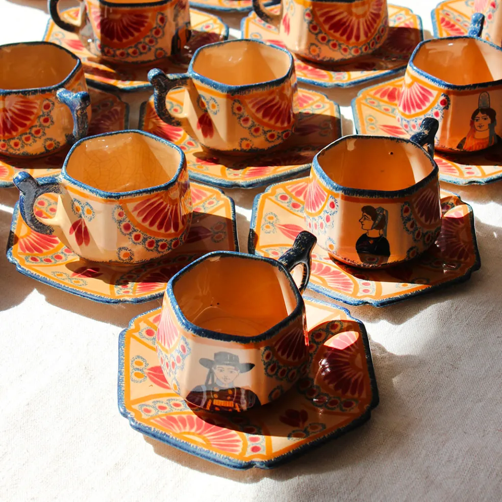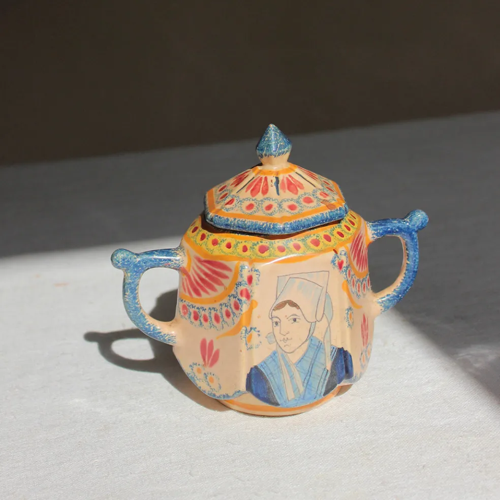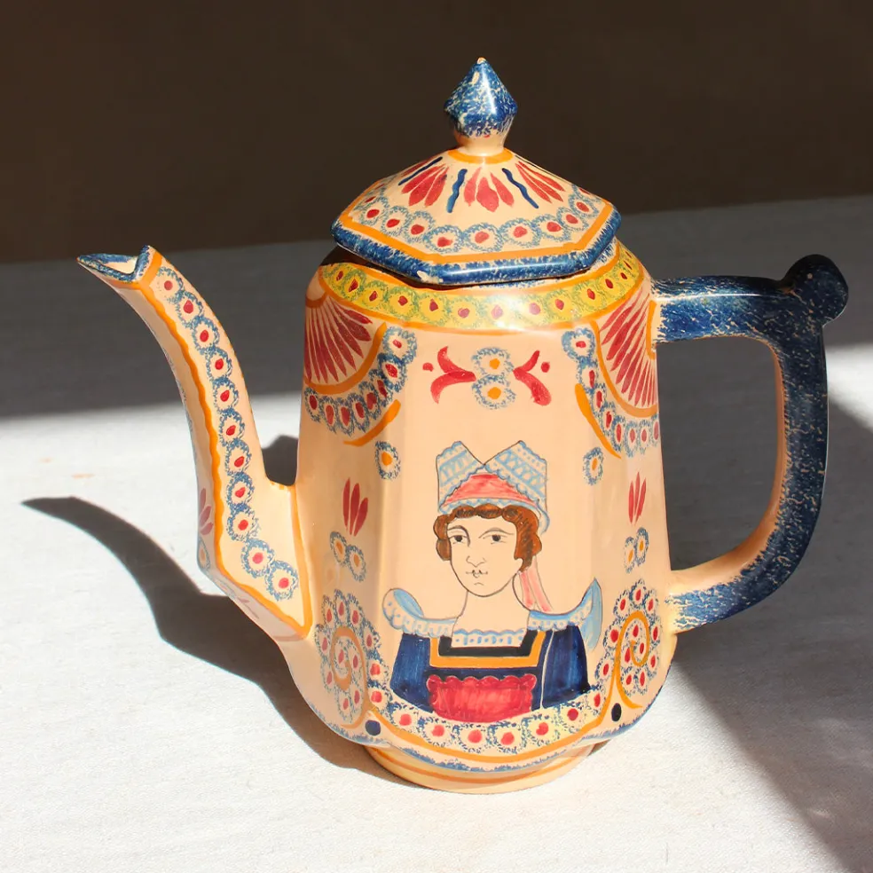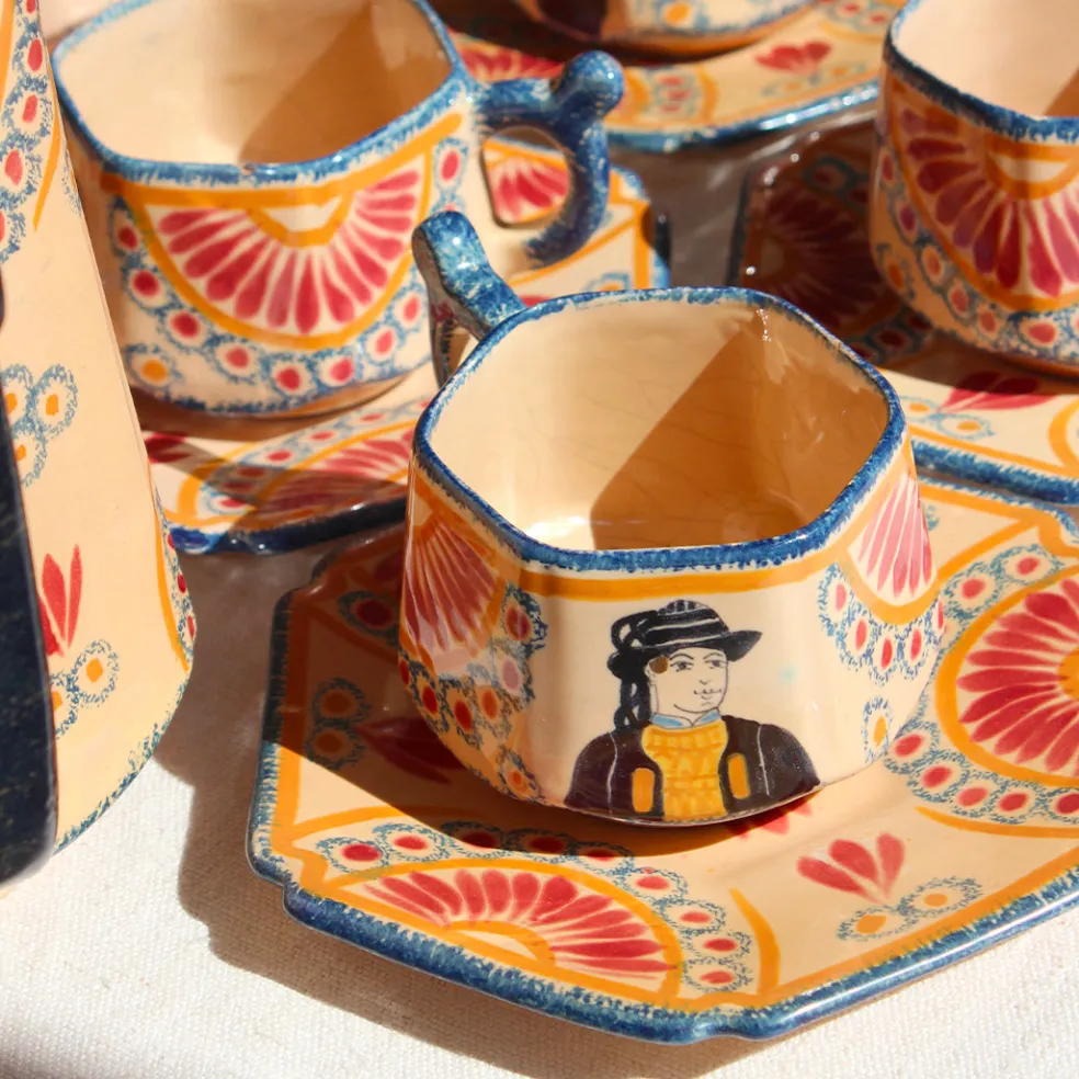 Un exceptionnel service à café en faïence de Quimper datant des années 30-50 aux couleurs chaudes. Il est composé de onze tasses et leur soucoupe, une théière, un pot à lait et un sucrier. Chaque tasse présente des personnages différents typiques de la céramique bretonne.
