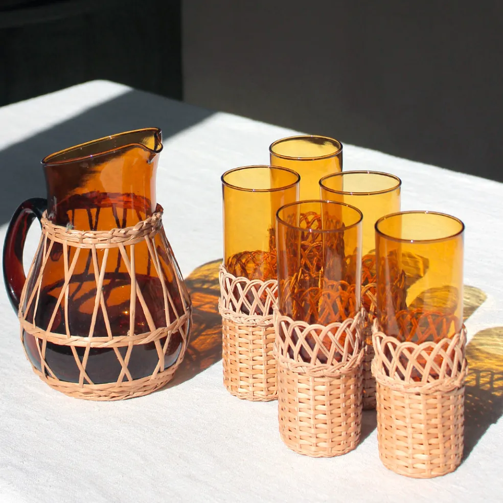 Service à orangeade des années 70′ en verre soufflé « ambré » cerclé d’osier, composé d’une carafe et de cinq verres.
