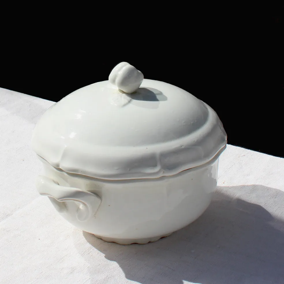 Jolie soupière de taille moyenne, dotée de fines poignées et d’un couvercle coiffé d’un fruit. Un modèle charmant et intemporel, pratique pour servir un accompagnement, un plat chaud ou une soupe.