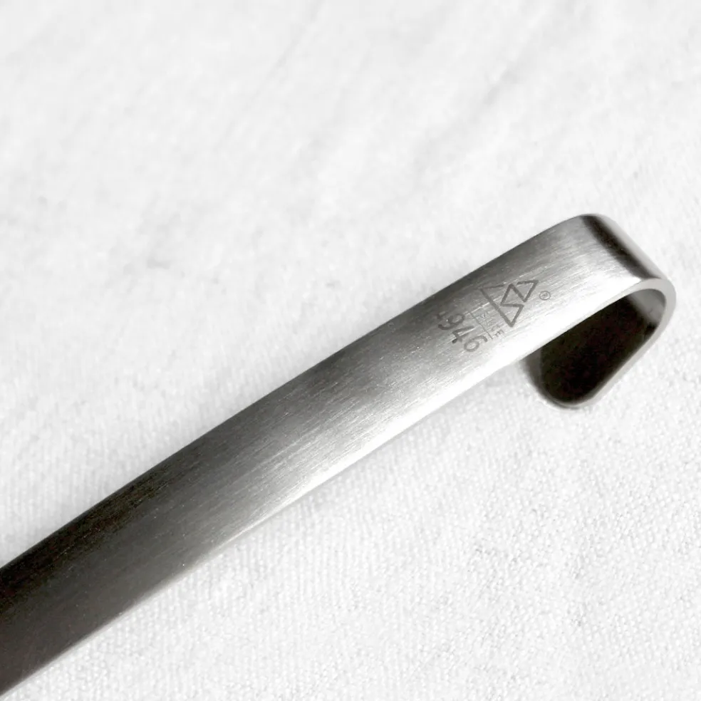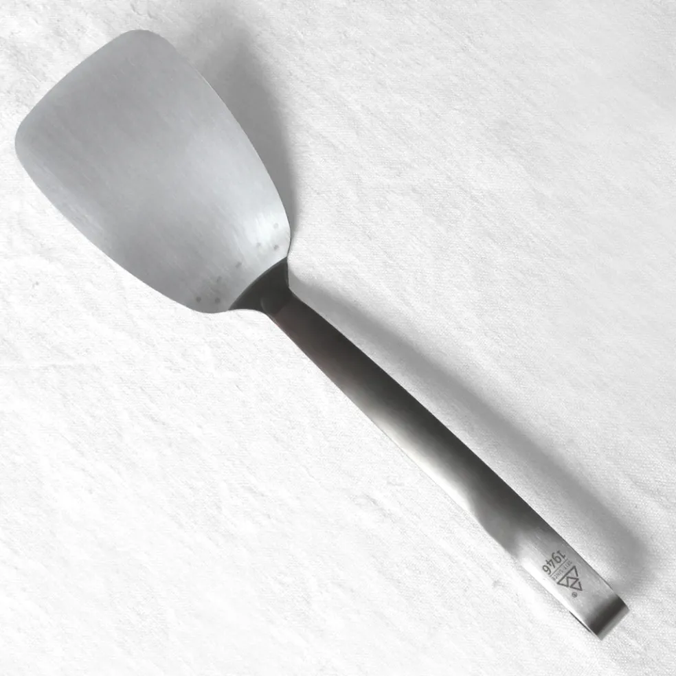 Étonnante spatule en inox brossé à la plateforme souple qui est donc très maniable pour la cuisson de certaines préparations délicates à la poêle (œufs, crêpes, petites galettes, etc.). Son manche crocheté permet de la suspendre dans une cuisine.